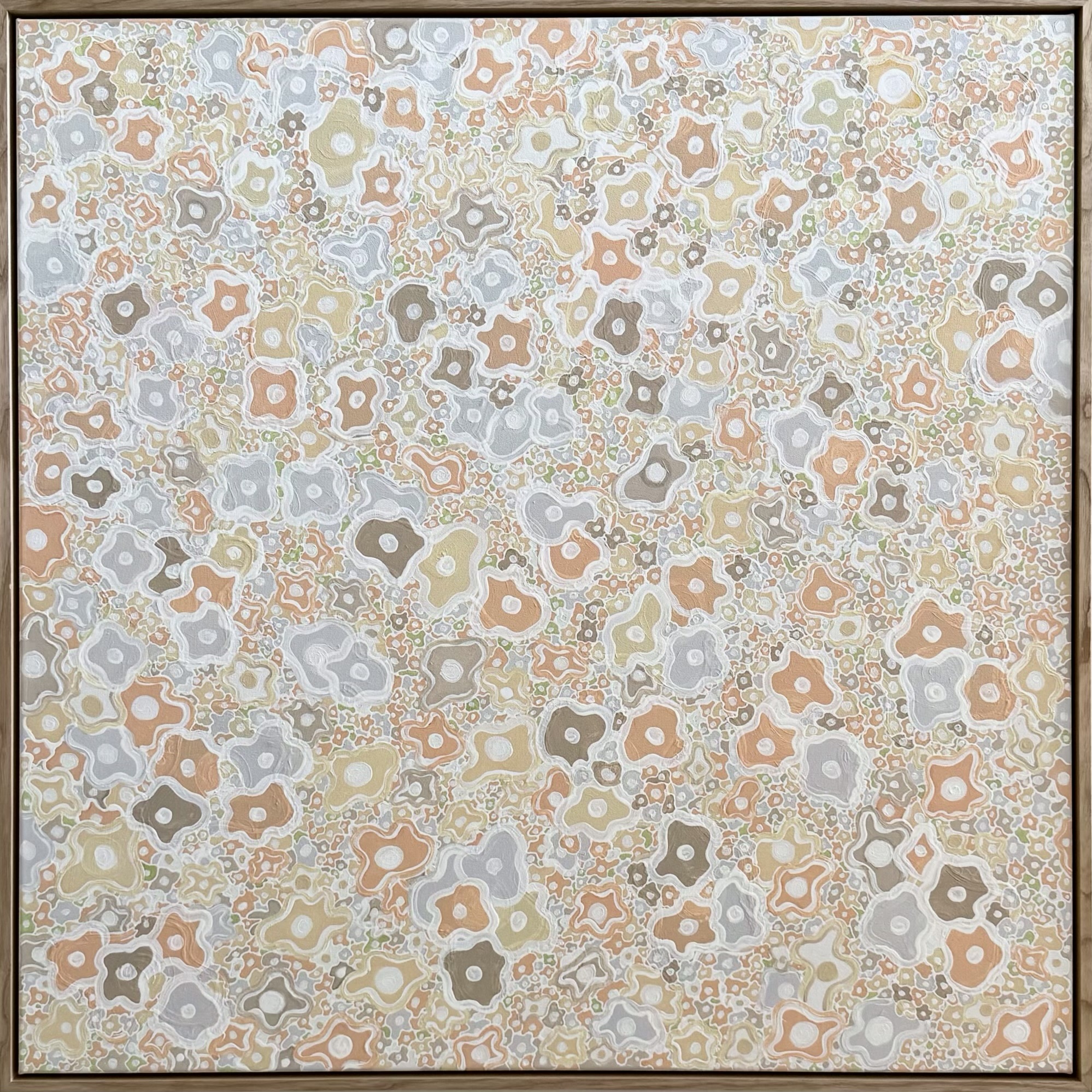 Abstract painting using free form shapes to create patterns, layer upon layer of shapes and colour to create depth.