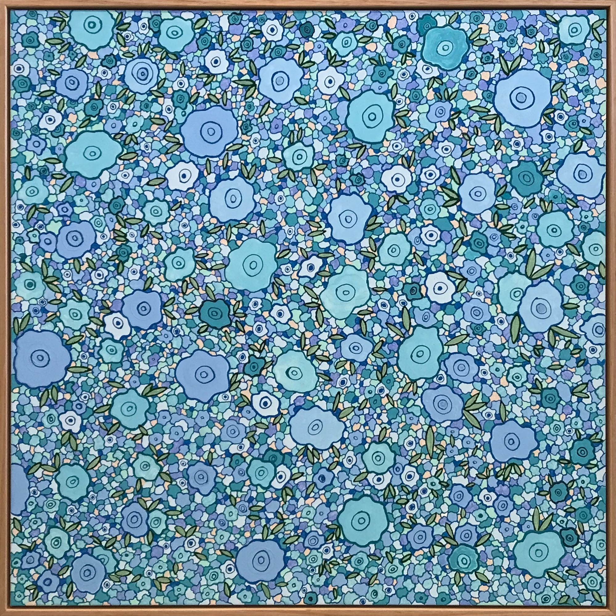 Abstract painting using free form shapes to create patterns, layer upon layer of shapes and colour to create depth. Beautiful blue tones.
