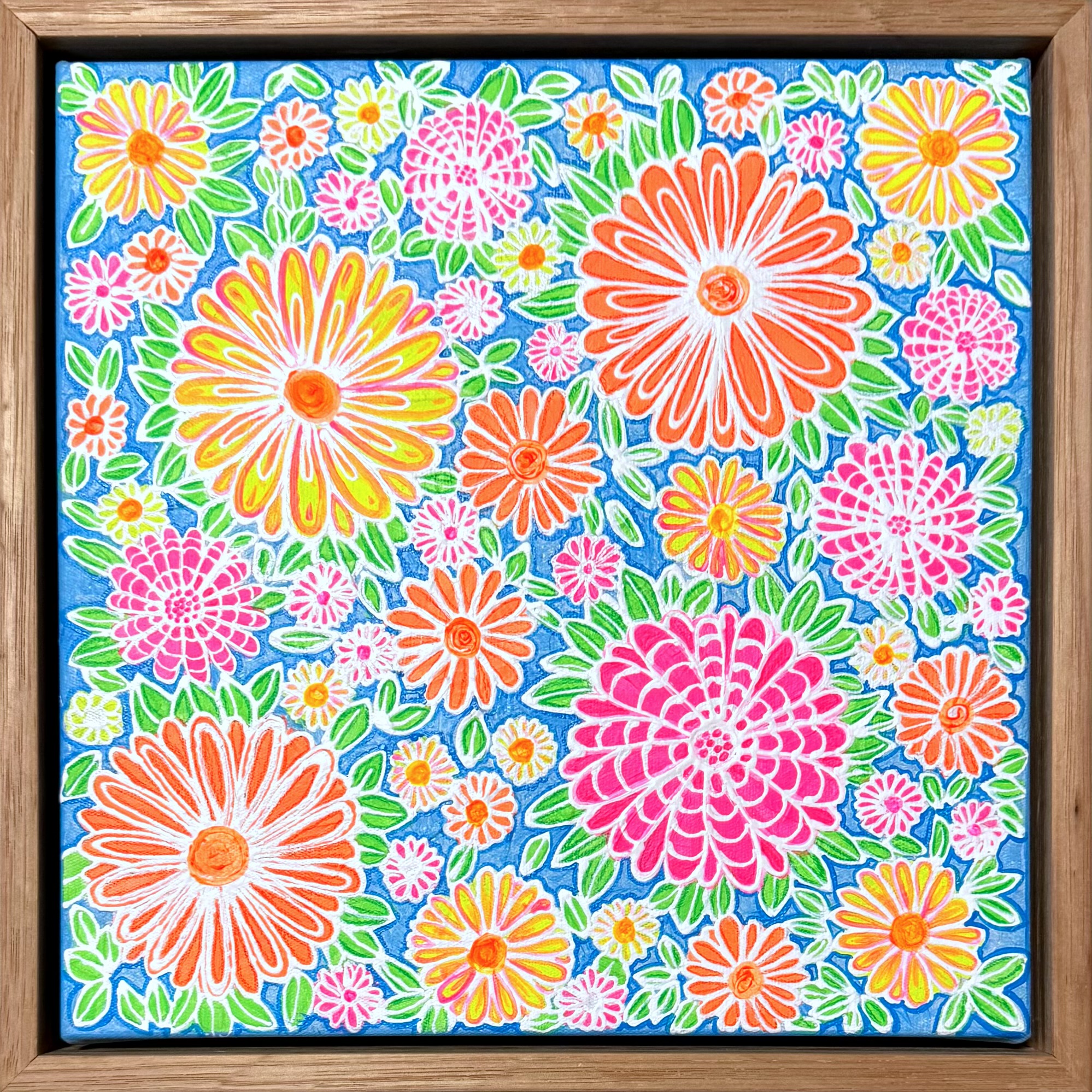 Beautiful bright coloured flowers. Fluoro orange, pink and yellow flowers. Each shape outlined in white to add depth.