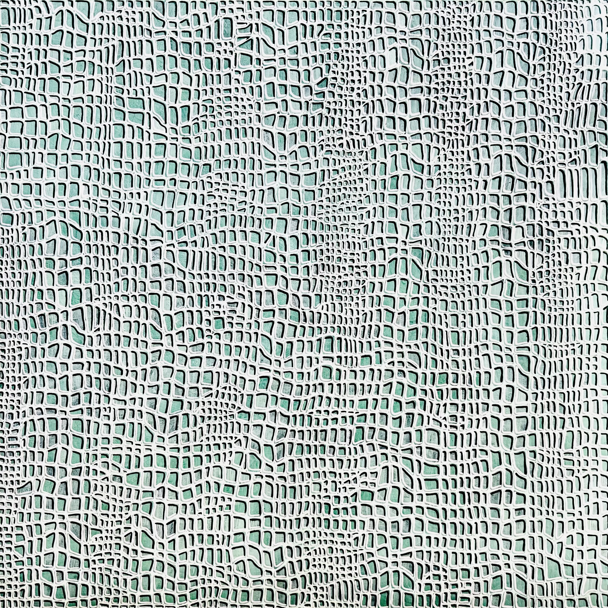 Abstract painting using repeated free form shapes to create patterns, layer upon layer of shapes and colour to create depth. Beautiful soft mint green. Each shape highlighted to give a 3d affect.