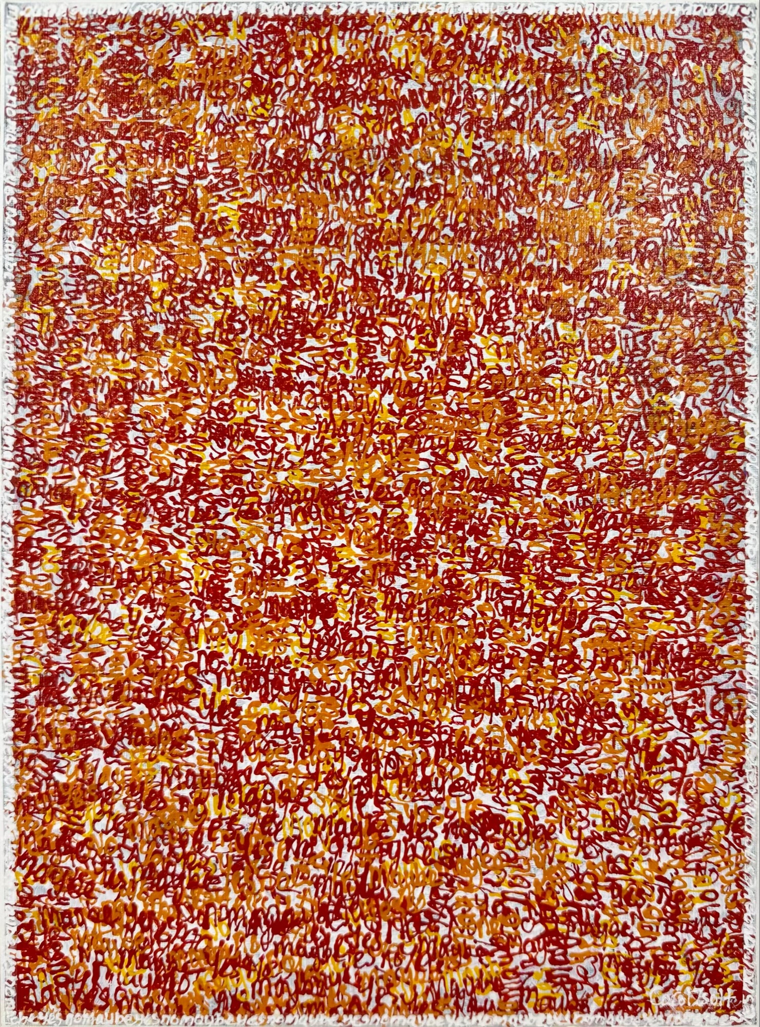 Abstract painting with the words ‘yes, no, maybe’ repeated to create the effect.