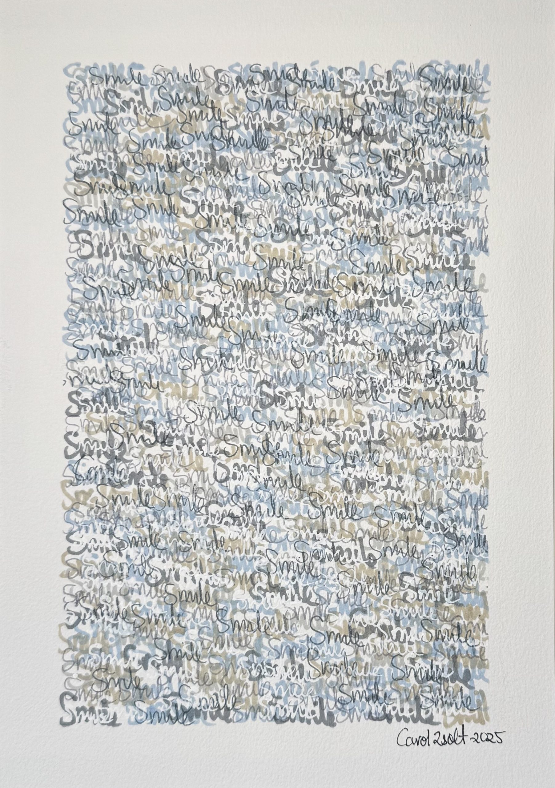 Abstract painting with the word ‘smile’ repeated.  We all deserve to smile more.