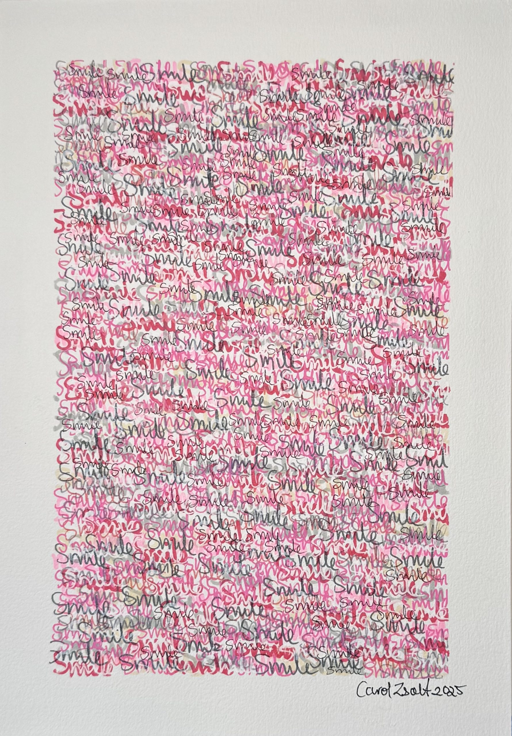Abstract painting with the word ‘smile’ repeated.  We all deserve to smile more.