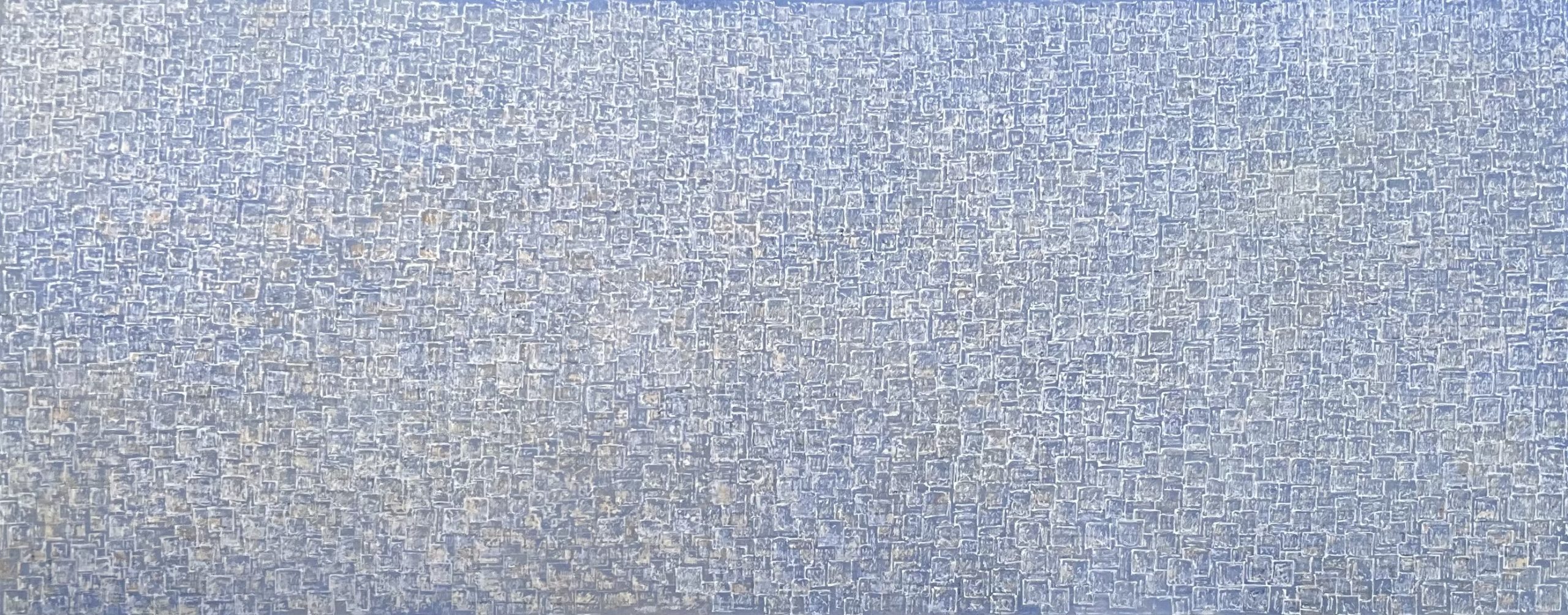 Abstract painting using square patterns. Beautiful blue grey with a touch of tan, and finished with white patters. Layers of colour scratched off to create the patterns.
