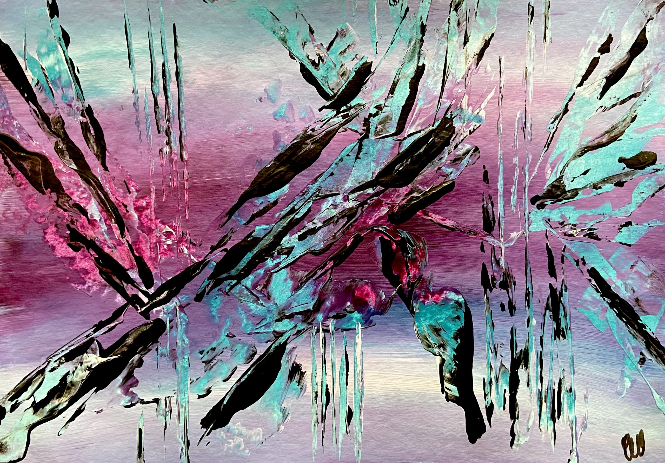 Interlace by Carrie Welsh is a beautiful abstract with a gorgeous colour combination that will lift any space. Some images show what this piece looks like framed. Frames not included. 29.7 x 42 cm (A3 size) Acrylic on paper. Requires framing.