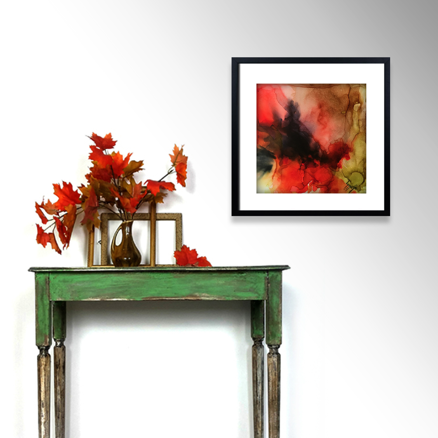This stunning piece is created with alcohol inks with the beautiful palette of autumn colours, orange, red, green and tans.