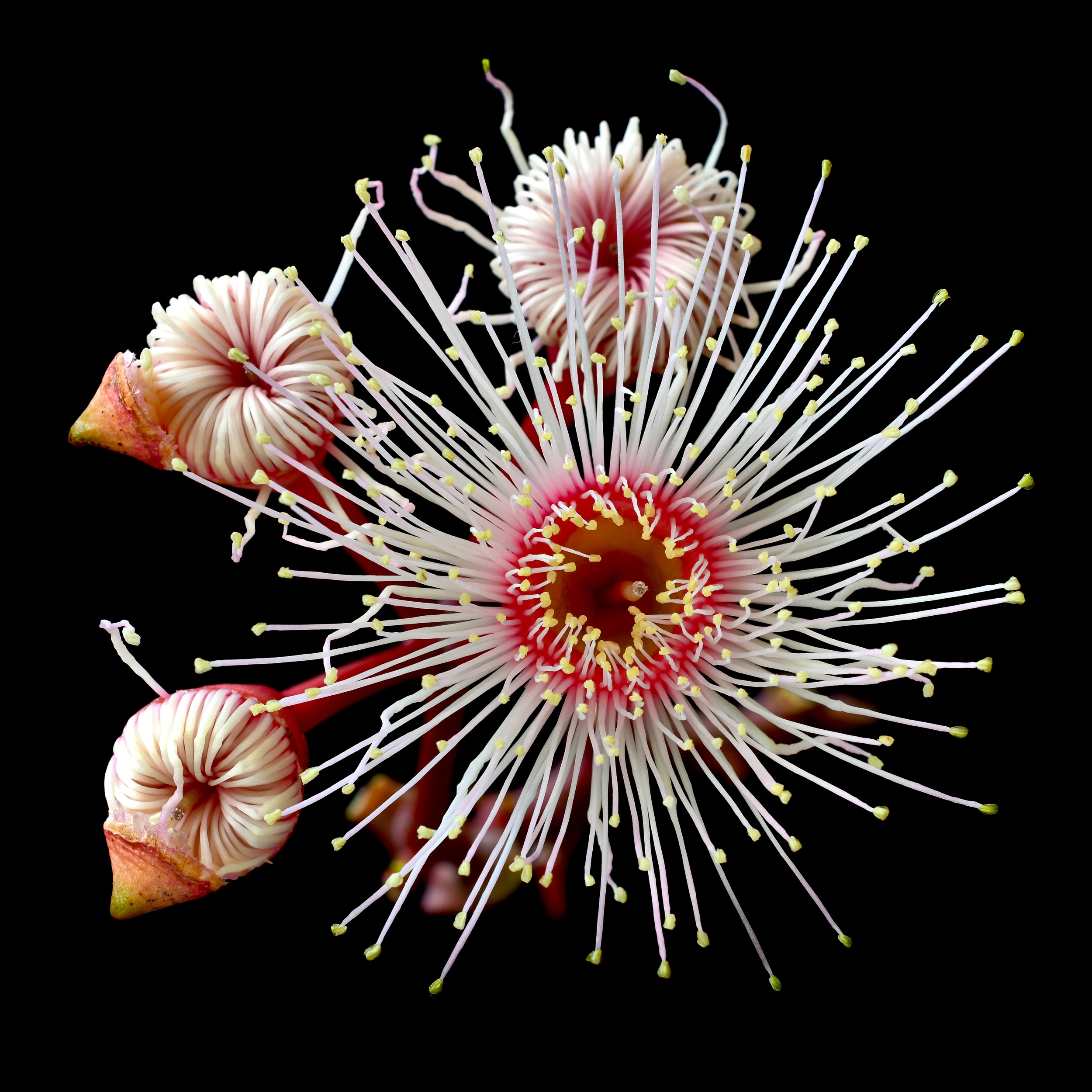Australian native pink Summer Beauty Eucalyptus blossoms – threads unravelled and spiralling out of control.