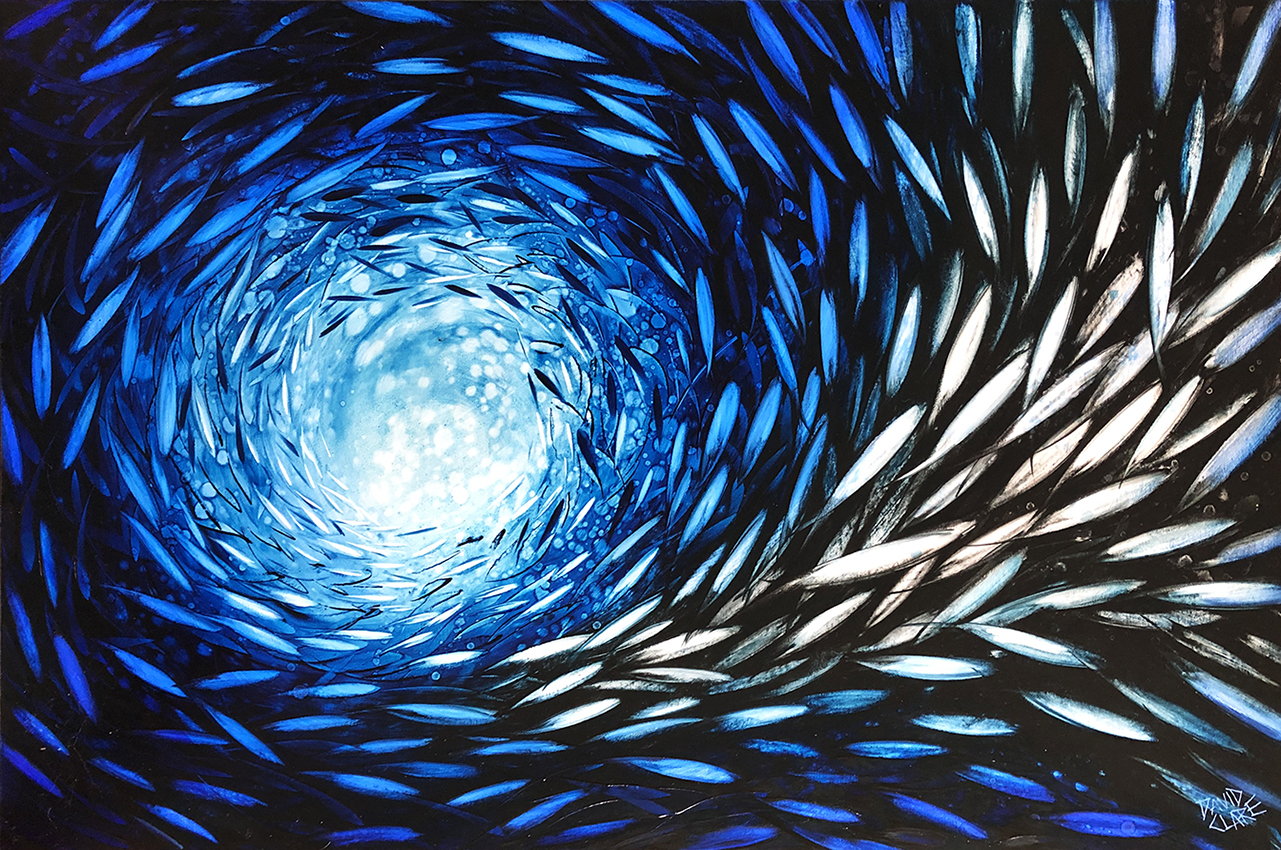 Inspired by the depths and colour of the ocean and the movement of schools of fish. Light shining through deep electric blue’s, turning silvery black as the fish dive to the depths.