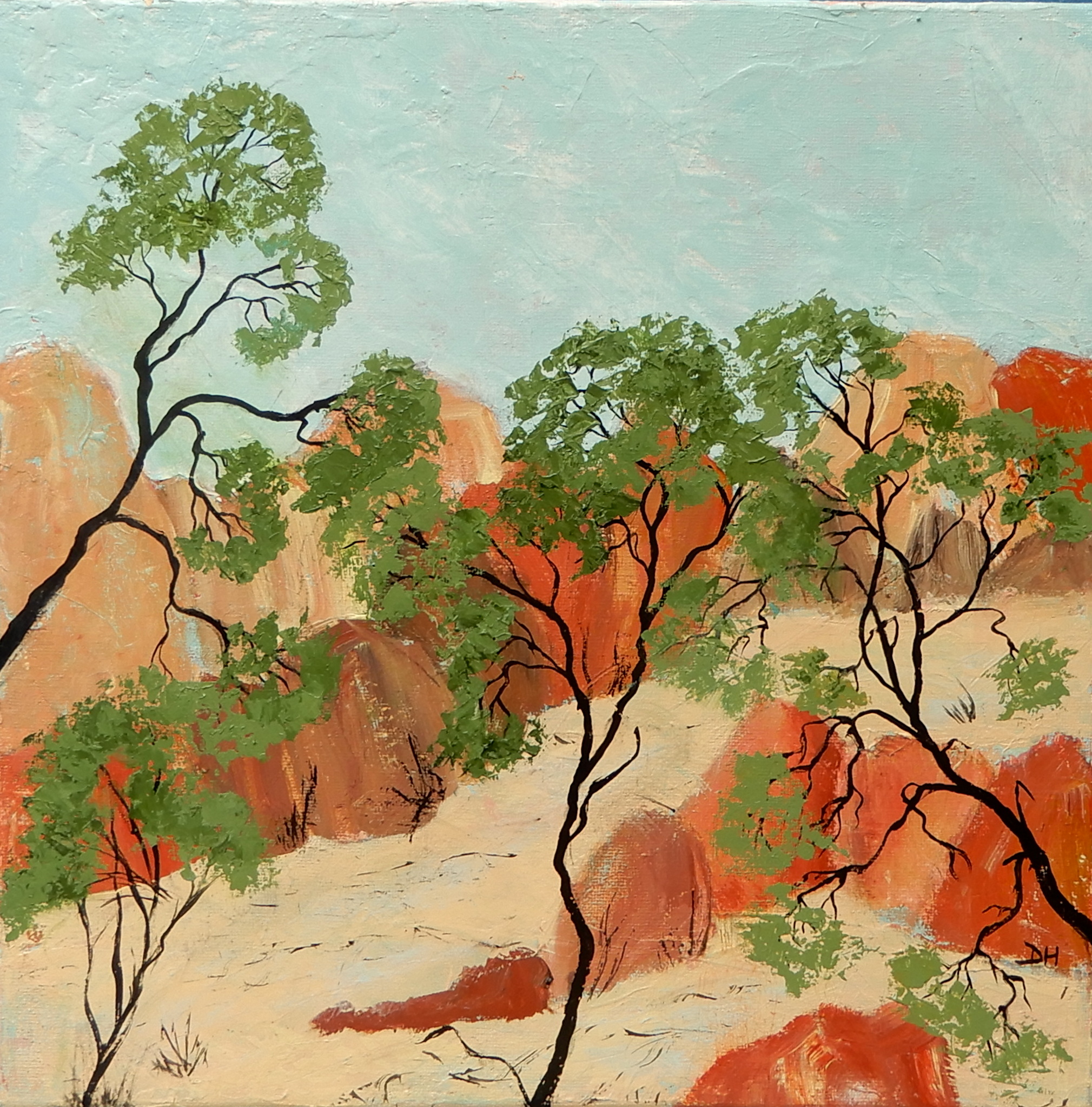 A gorge in the Red Centre – red rocks, warm sands and eucalypts fed by ephemeral water.
