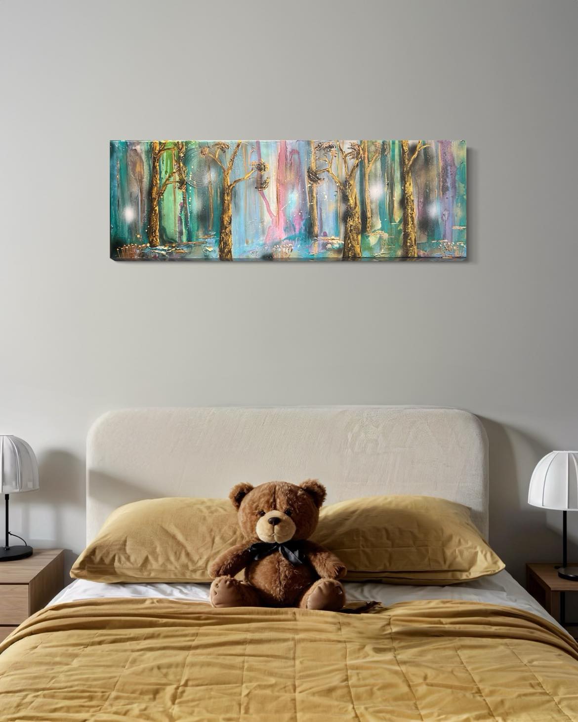 Into The Light is a springtime ode to the beauty and lightness that comes with the warmth of the sun. It’s a time to rejoice, connect and be grateful for the beauty of the land. Featuring beautiful textures and the signature golds of Emily’s work, Into the Light would be a stunning piece for over a console or bed.