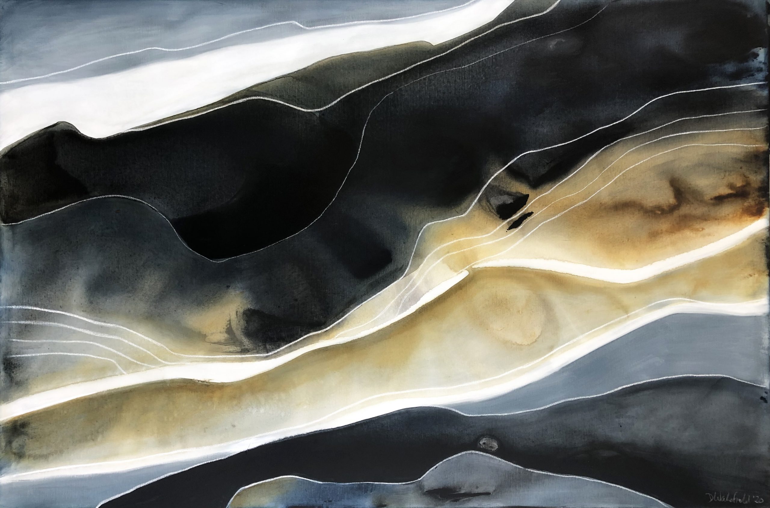 Into the Mystic 8 by Dinah Wakefield is inspired by the light, the colours and the natural beauty of the Noosa region of Australia. “What I love most about Noosa is the interplay of light. From the oceans to the clouds, to the river estuaries and the hinterland, this canvas unfolds before me every day and finds expression in my paintings”.