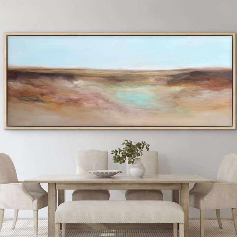 This artwork is painted on professional-grade canvas stretched and sealed with varnish. The canvas has dimensions 198 cm in width by 107 cm in height. The painting wraps around the sides of the stretcher, so the sides are painted in the same style as the surface. As such it does not need a frame.