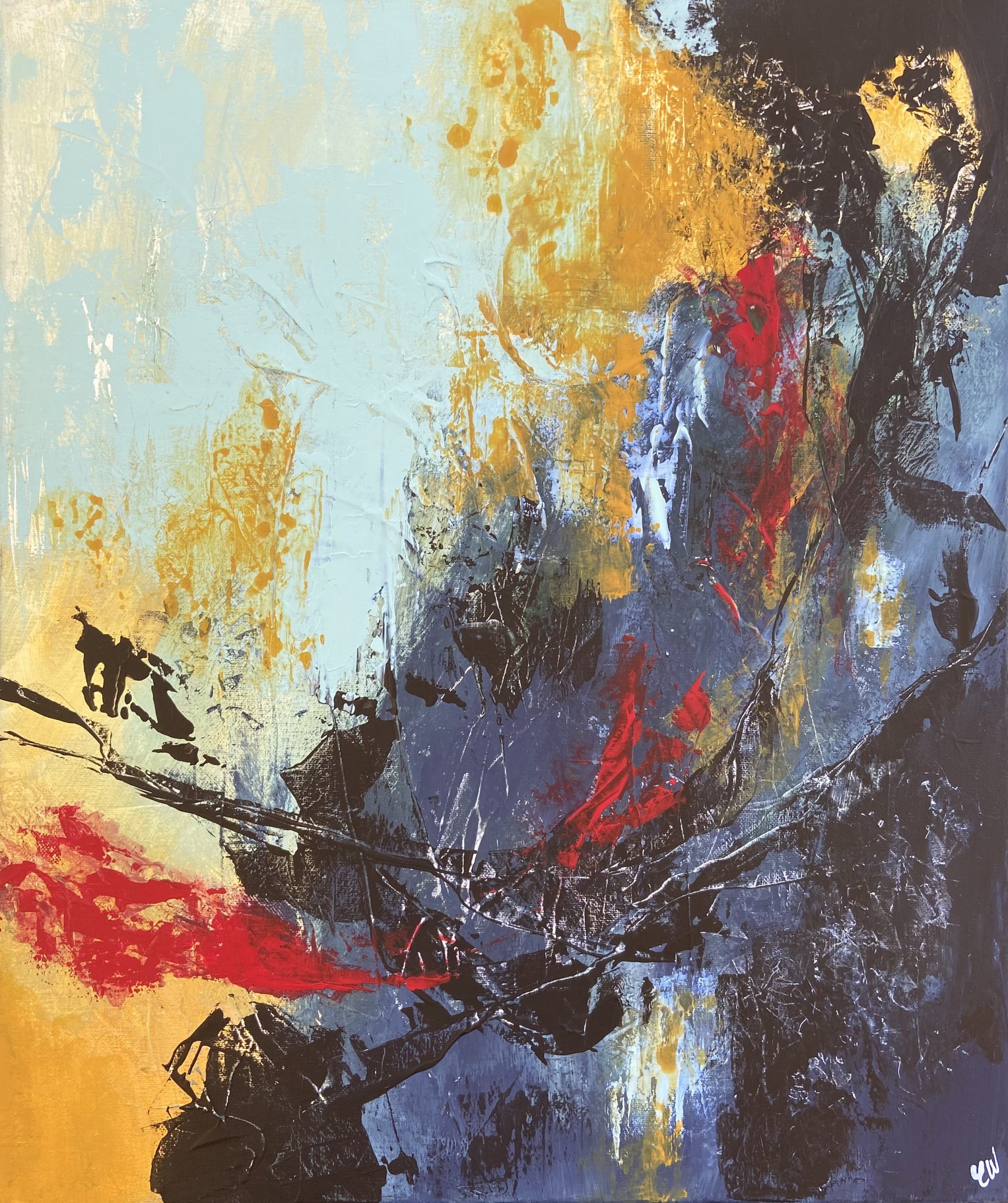 Intuitive by Carrie Welsh is a beautiful abstract painting with a bold colour palette. 60 x 50 cm. Acrylic on canvas, ready to hang. Frame not included.