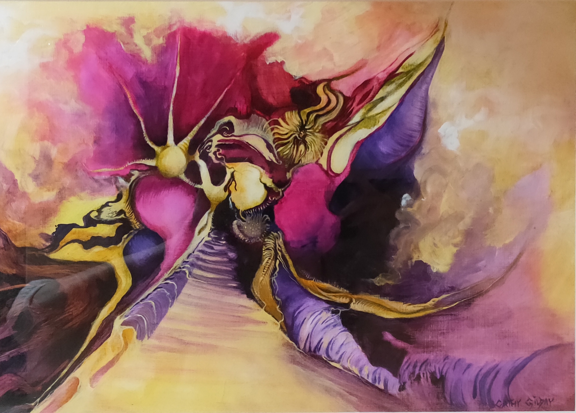 Invasion by Cathy Gilday – I love to create fantasy landscapes! Imagination is such a fabulous journey. Lots of coloured glazes and intricate work, with a fine rigger brush were used, to create the crustacean type invaders! Total measurement of framed piece W57cm x H45cm x D1.5cm.