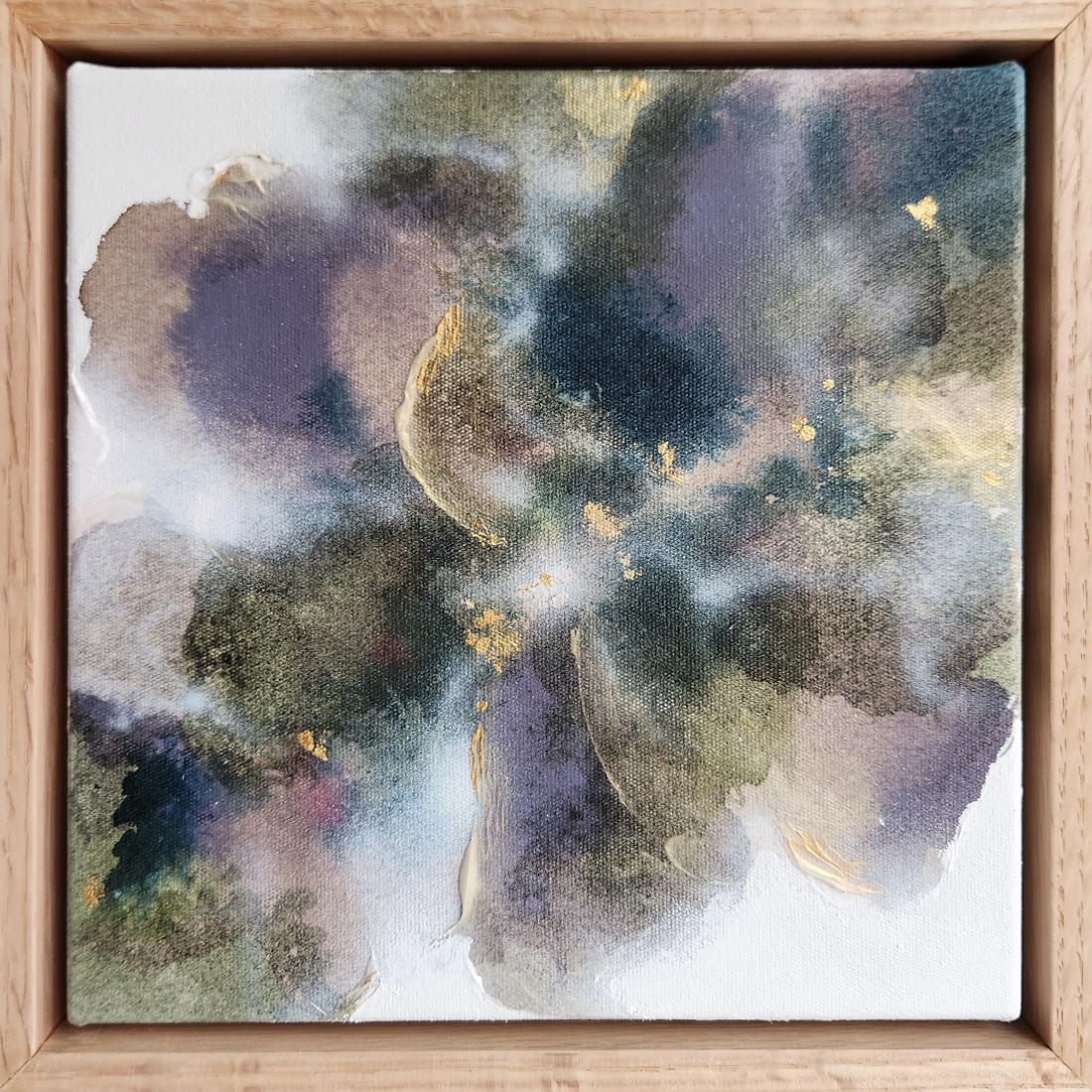 ‘Iris’Â by Fern Siebler is a muted mini artwork featuring dreamy tones of mauve, blue, gold, green. This piece can stand freely, such as on an entry way sideboard or desk, or be hung on your wall.