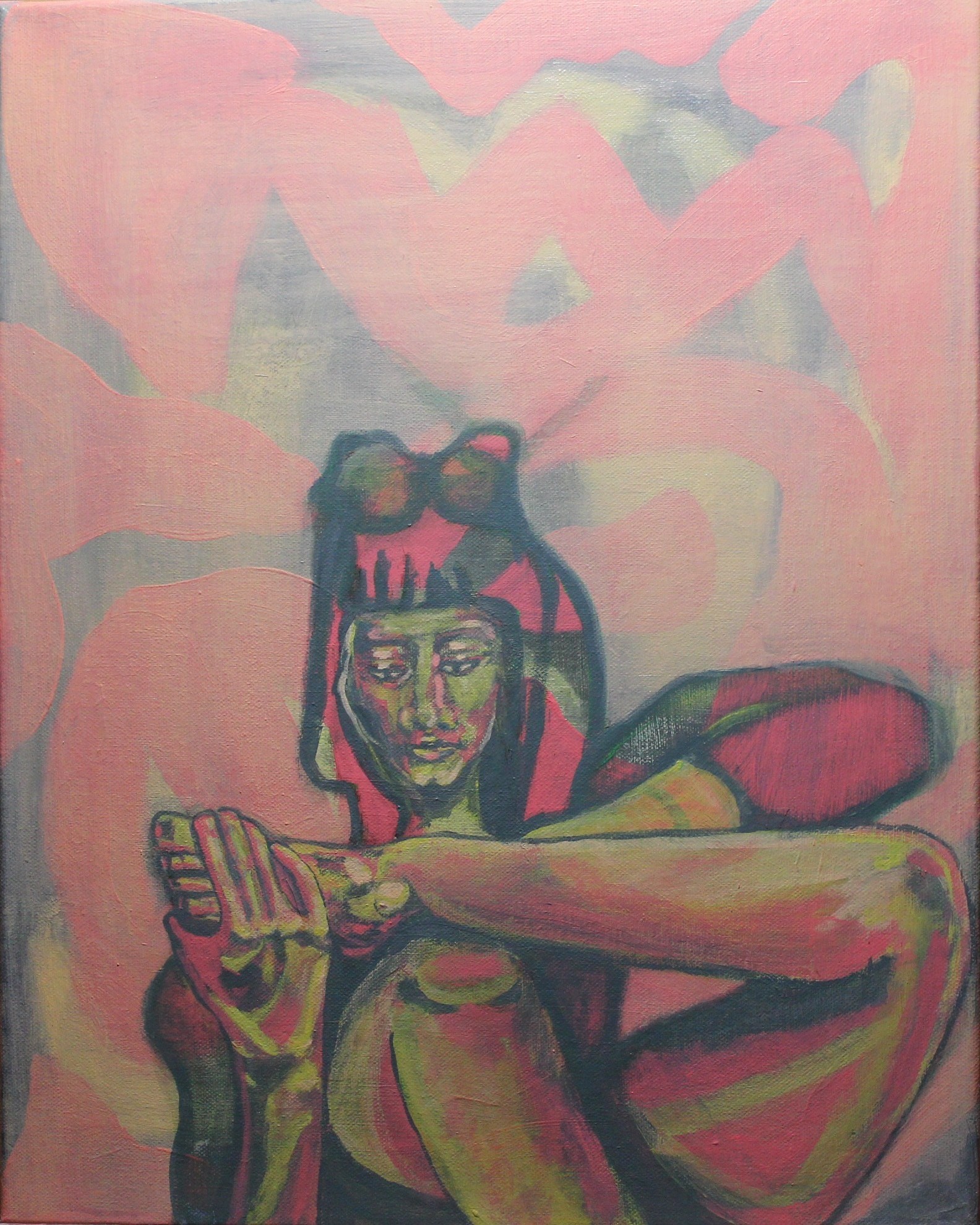 This is an interesting piece full of contrast with both soft and vivid tones of pink, blue and green. The soft haze in the back ground offers calm and solace to our figure who is almost camouflaged, if not for the bold emotions we can see in full colour and form. Lifting up her own foot, in a moment of disorientation. Is this mine….? This piece delves into the psyche of disorientation, while retaining a bright and fun ‘cover’. Enjoy it either way, this piece may offer different meanings to each viewer.