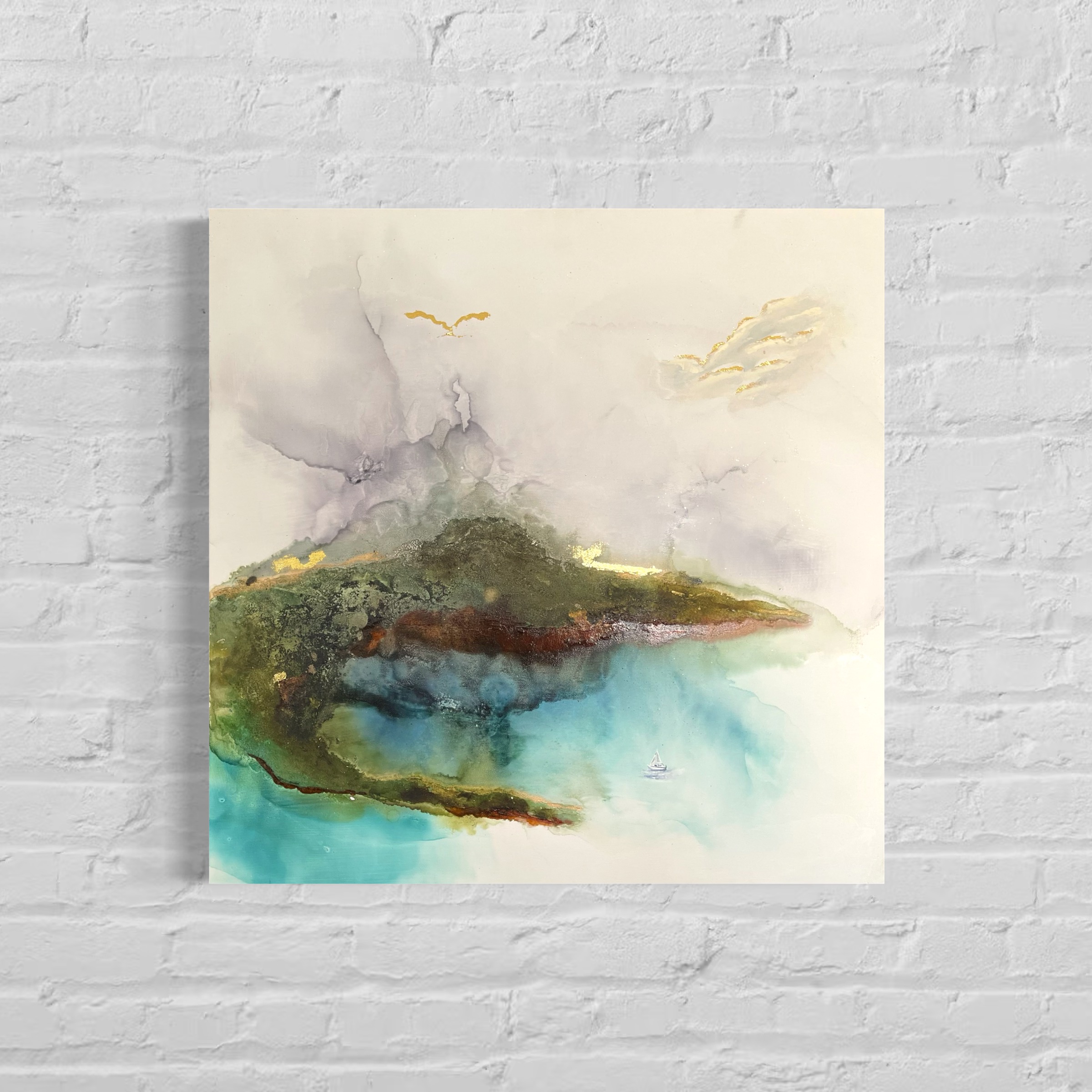 “Island Life” evokes the serenity of untouched landscapes and the gentle rhythm of ocean tides. Flowing layers of deep greens and earthy browns rise like a lush island against a soft, ethereal sky. Hints of gold glimmer through the terrain, catching the light like sunbeams breaking through cloud. Below, tranquil turquoise waters cradle a solitary sailboat, inviting reflection on stillness, solitude, and the quiet beauty of life by the sea.