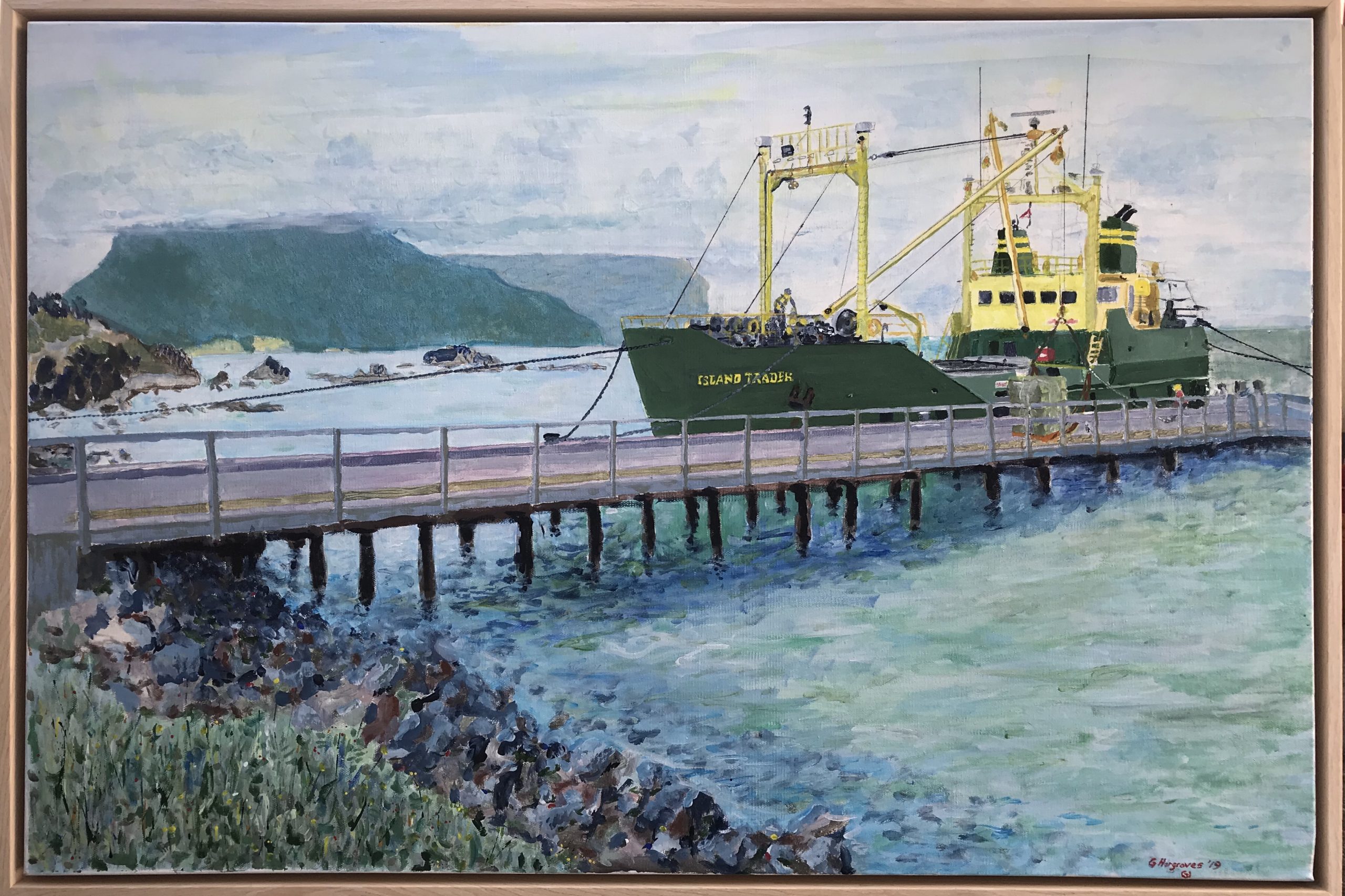 I based this painting on a photo I took one morning when the Island trader was unloading.