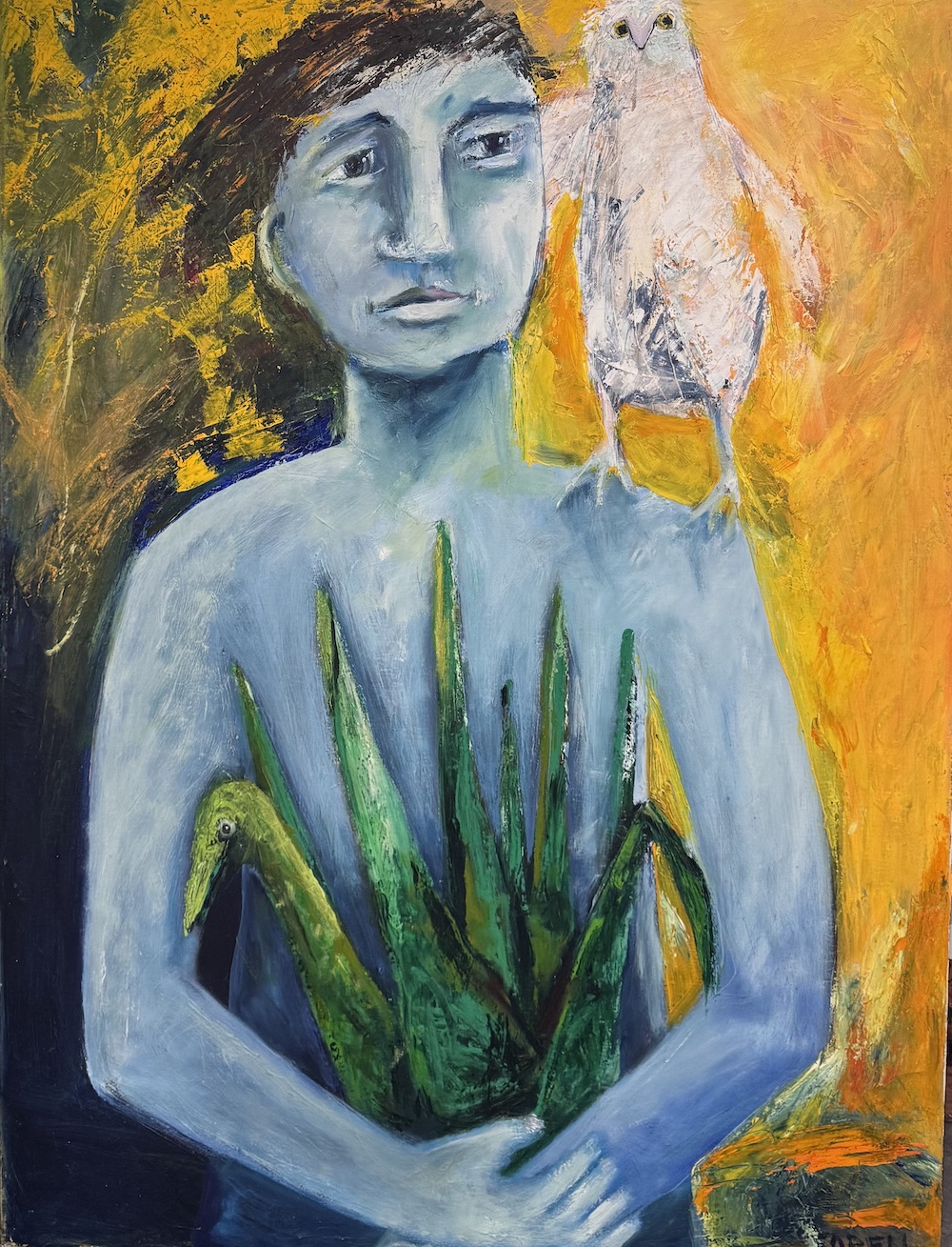 It Rained Last Night by Saren Dobkins – A figure holds a crown of grasses, verdant green after raising from the ashes. The crown transposes into a swan like bird, it’s eye looks outwards, grateful to be held. On his shoulder, a white owl stands, her farsightedness sees what we cannot see. She touches his head seeking and both giving reassurance. Together they stand. Man and Nature interconnected always. Drought broken, he holds a crown of new shoots. The owl sees beyond, wary with trepidation. Painted in oils, this work has evolved and is thickly painted providing a rich tapestry of surface.