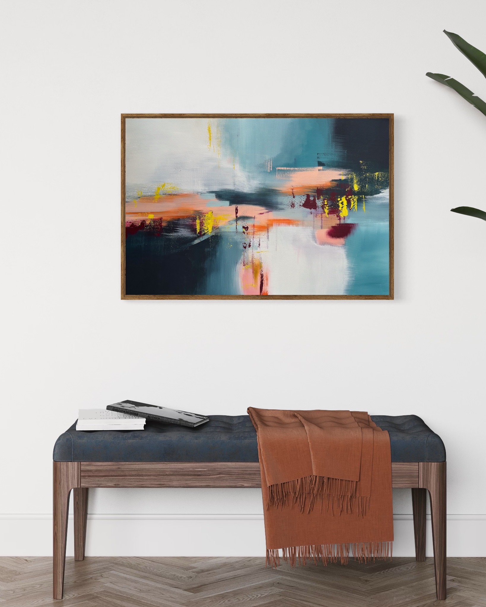 This abstract artwork envelops the viewer in a sea of serene blues, ranging from deep navy to ethereal sky hues, creating a calming yet emotive atmosphere. Through the use of colour and shapes, “It Will Be Alright in the End” invites viewers to pause, reflect, and find solace in the belief that despite challenges, there is always a promise of better days ahead.