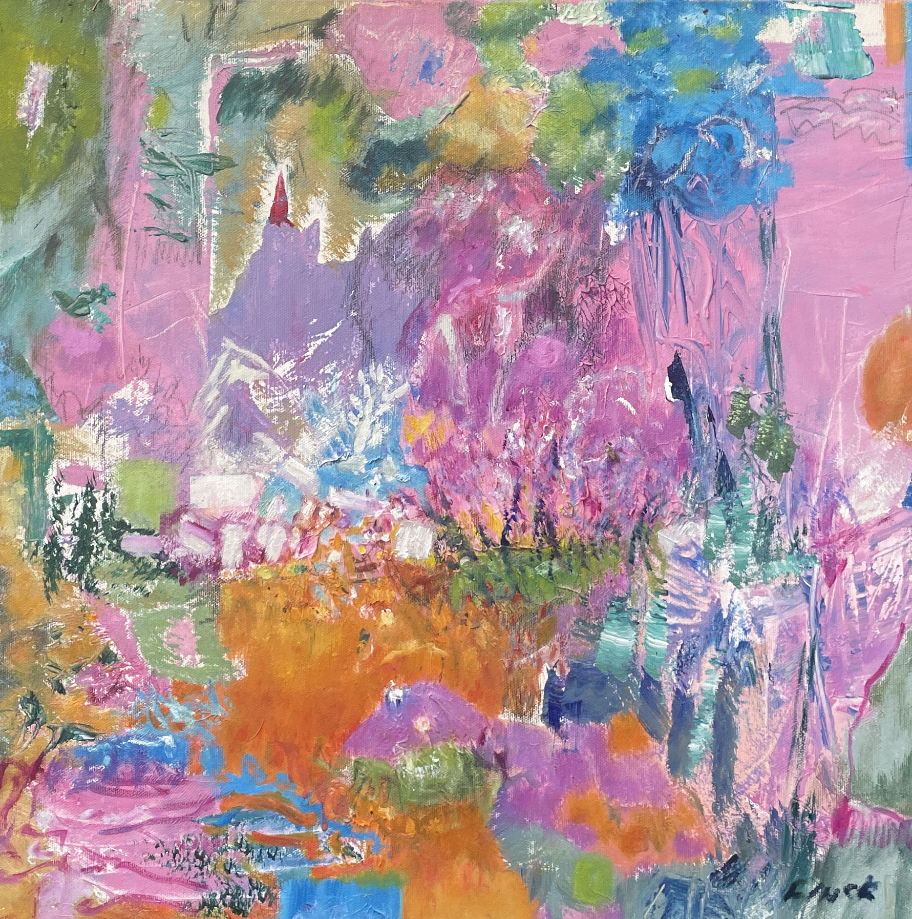 An abstract expressionist painting, featuring lots of bright colours including orange, pink, blue, yellow, green, and turquoise.