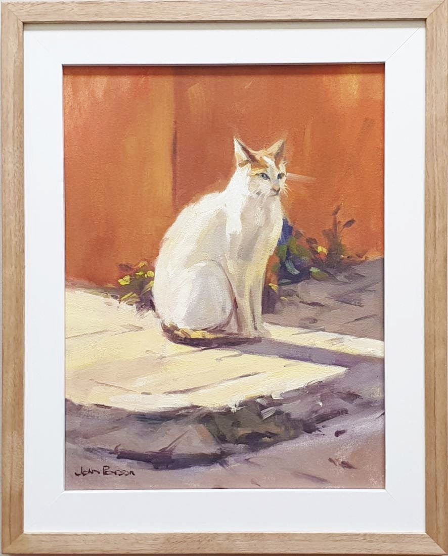 Original oil painting by John Pearson captures a moment of a beautiful cat sunning himself in the sun in Naxos