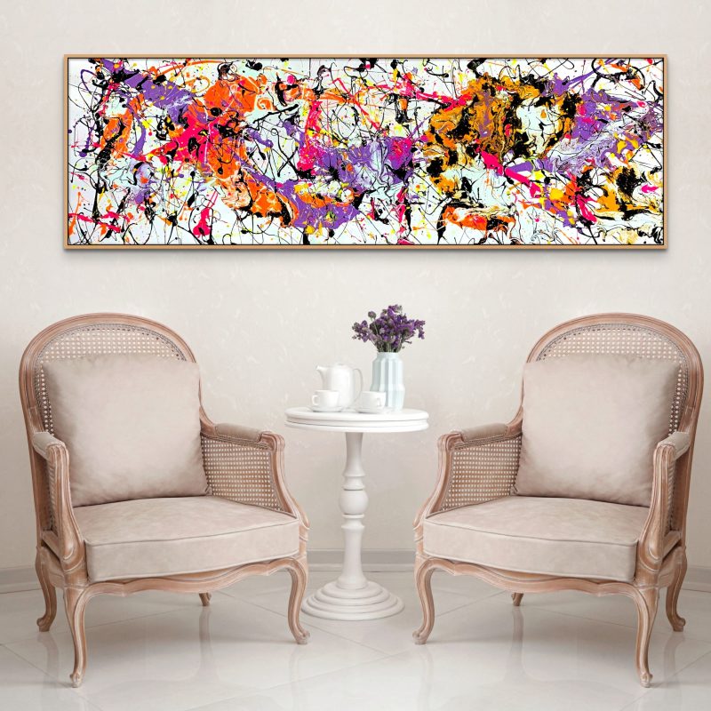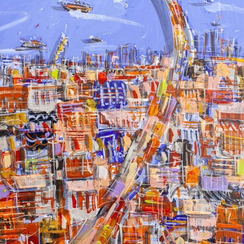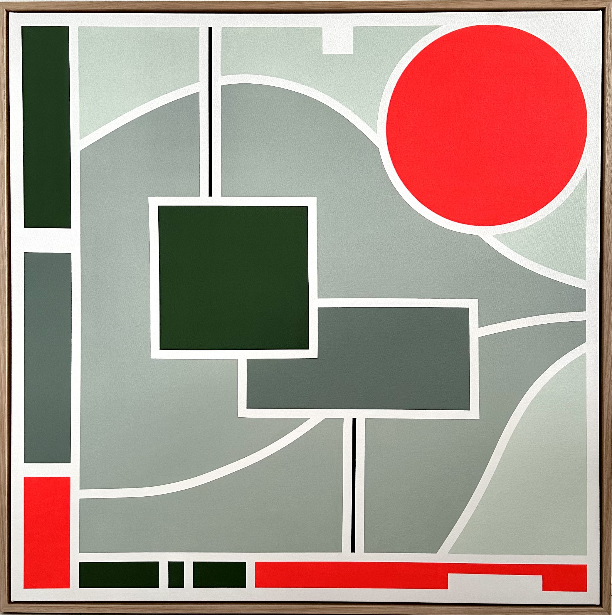 It’s Cold Outside by Harriet Sheard – Cooler tones of grey and greens set the tones for this painting- Wintery days sat by an open fire. A pop of florescent red, brings the piece alive and warms the cockles.