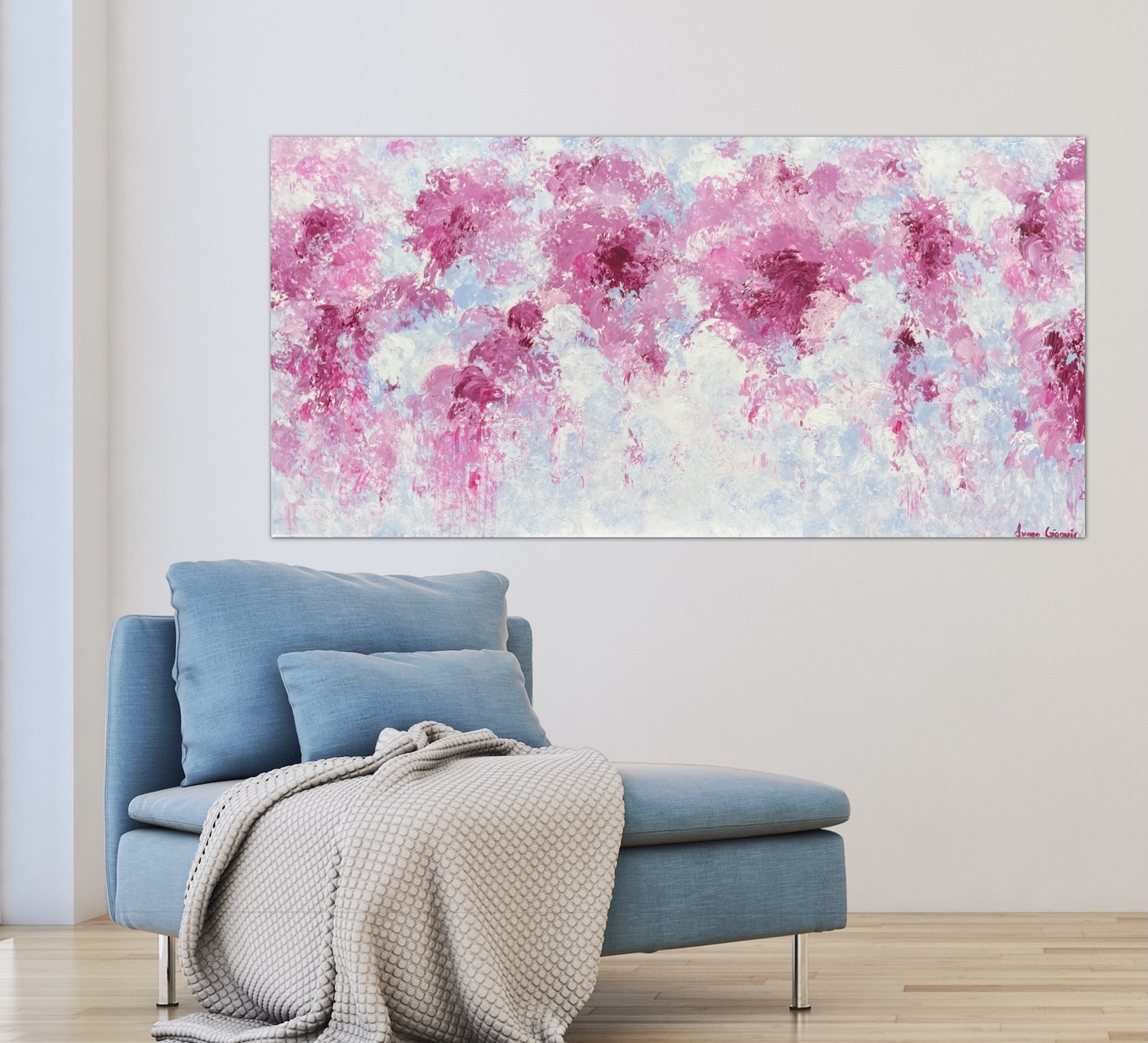 These soft yet vibrant shades emphasise the fresh colours of Summer’s florals. Fresh flowers and blue skies are always a great way to start a day! An artwork that adds a sense of calm to any room.