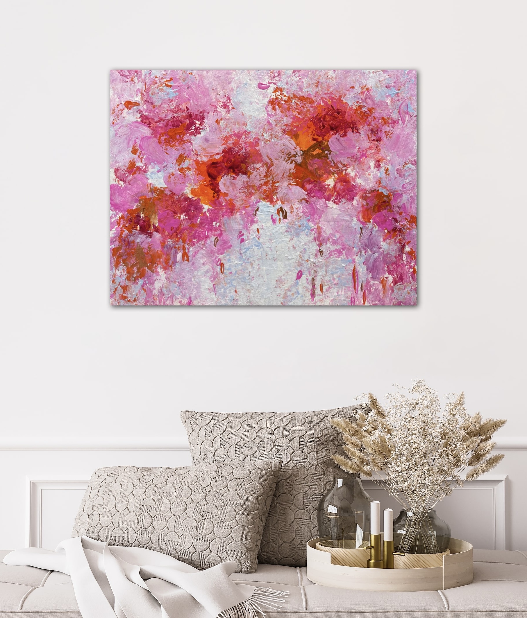 Colourful Summer florals have inspired me to create this abstract piece. I love these colours they are warm and add a sense of joy. A little bronze adds a special touch. A lovely addition to your home.