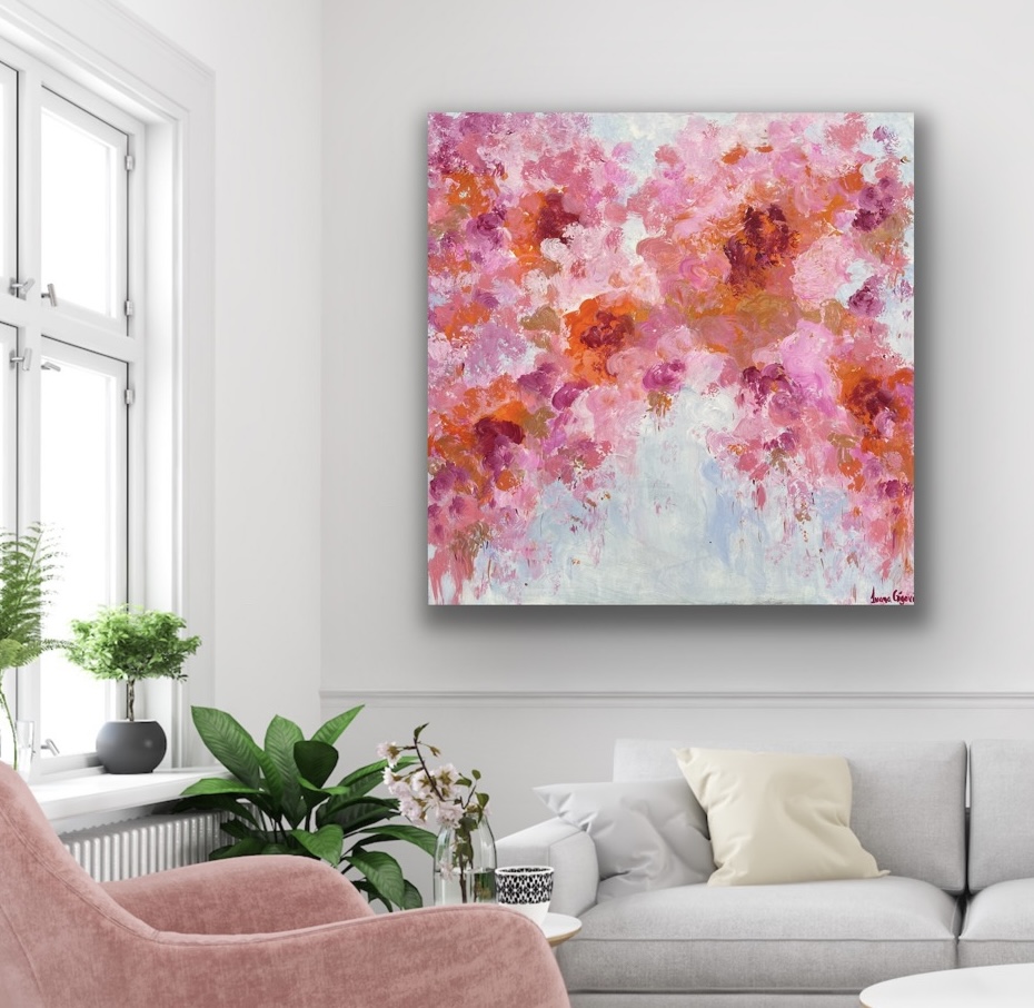 Large warm tone flowers emphasise the vibrant nature of this abstract floral artwork. A piece that adds a vibrant and warm touch to any space.