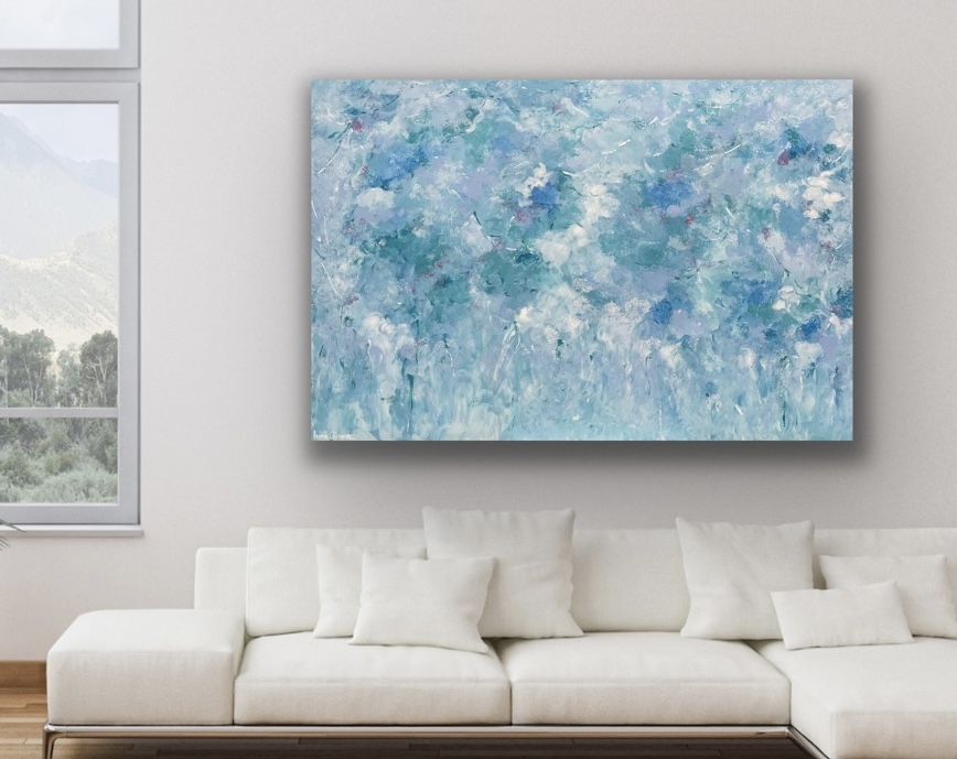 The latest addition to my ‘It’s love’ series is all about creating a sense of calm through soft shades of blues and greens. A touch of lilac adds a little bit of light throughout. A lovely fresh and modern addition to any space.