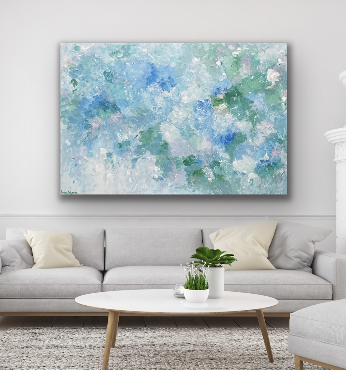 The latest addition to my ‘It’s love’ series is all about creating a sense of calm through soft shades of blue and greens. A touch of pink adds a little bit of light throughout. A lovely fresh and calm addition to any space.