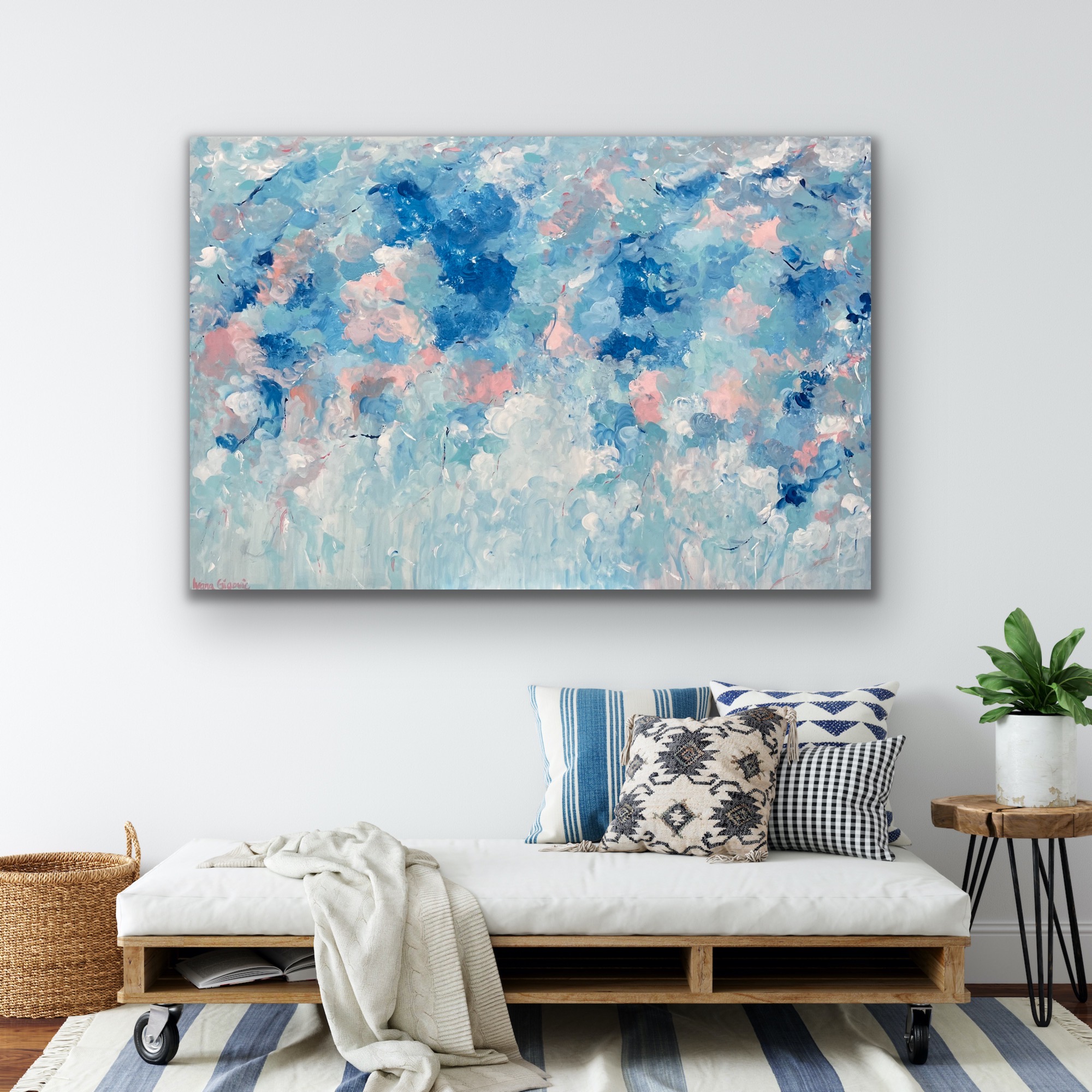 Lovely shades of blue and teal create a vibrant yet soft abstract piece. A touch of dusty pink and coral adds a little light to this artwork. A calm and soft addition to any room!