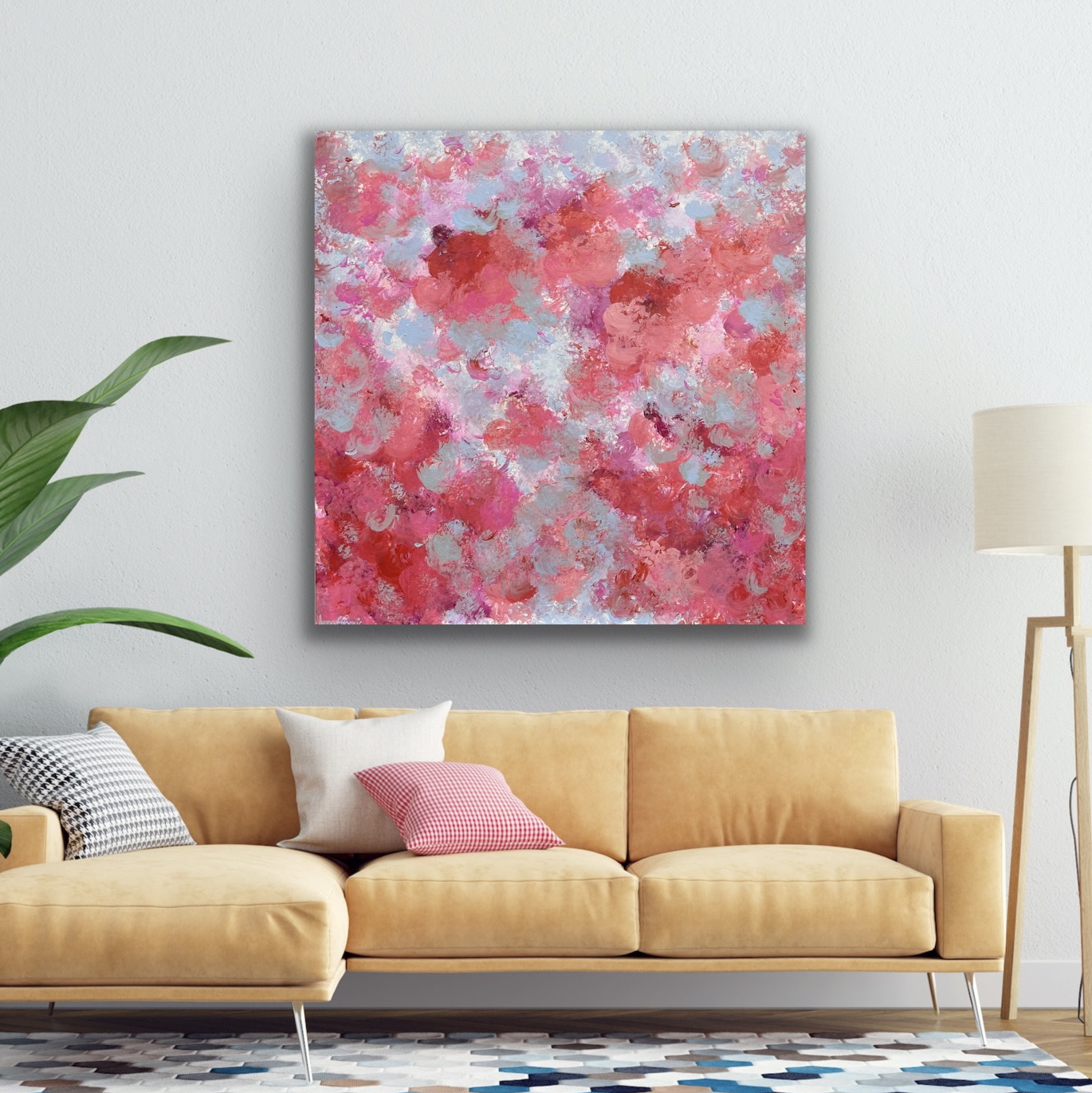 Vibrant and warm shades of pinks and purples create an artwork that lights up any space. A piece full of light and joy. A great addition to any room.