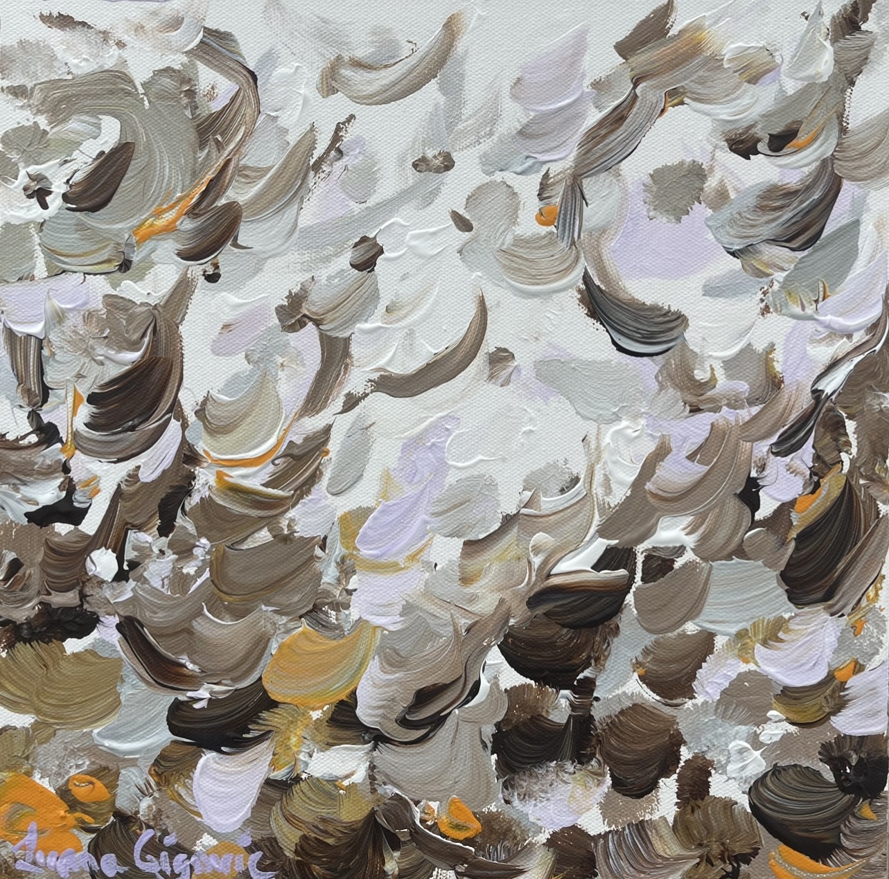 Neutral grey tones create a sense of depth and contrast. Soft brown tones add warmth and stability to this modern neutral piece.