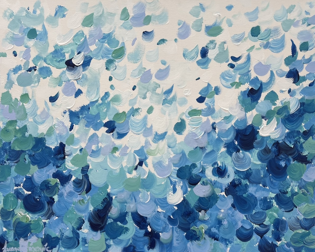 The blue and green colours used in this painting are associated with the beautiful nature around us, with blue representing the sky and water, and green representing plant life and growth. These colours create a feeling of calmness, tranquility, and balance, as well as a sense of connection to the natural world.