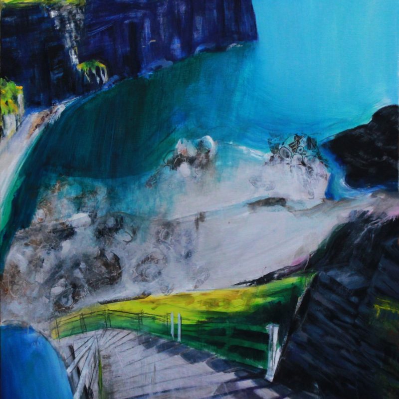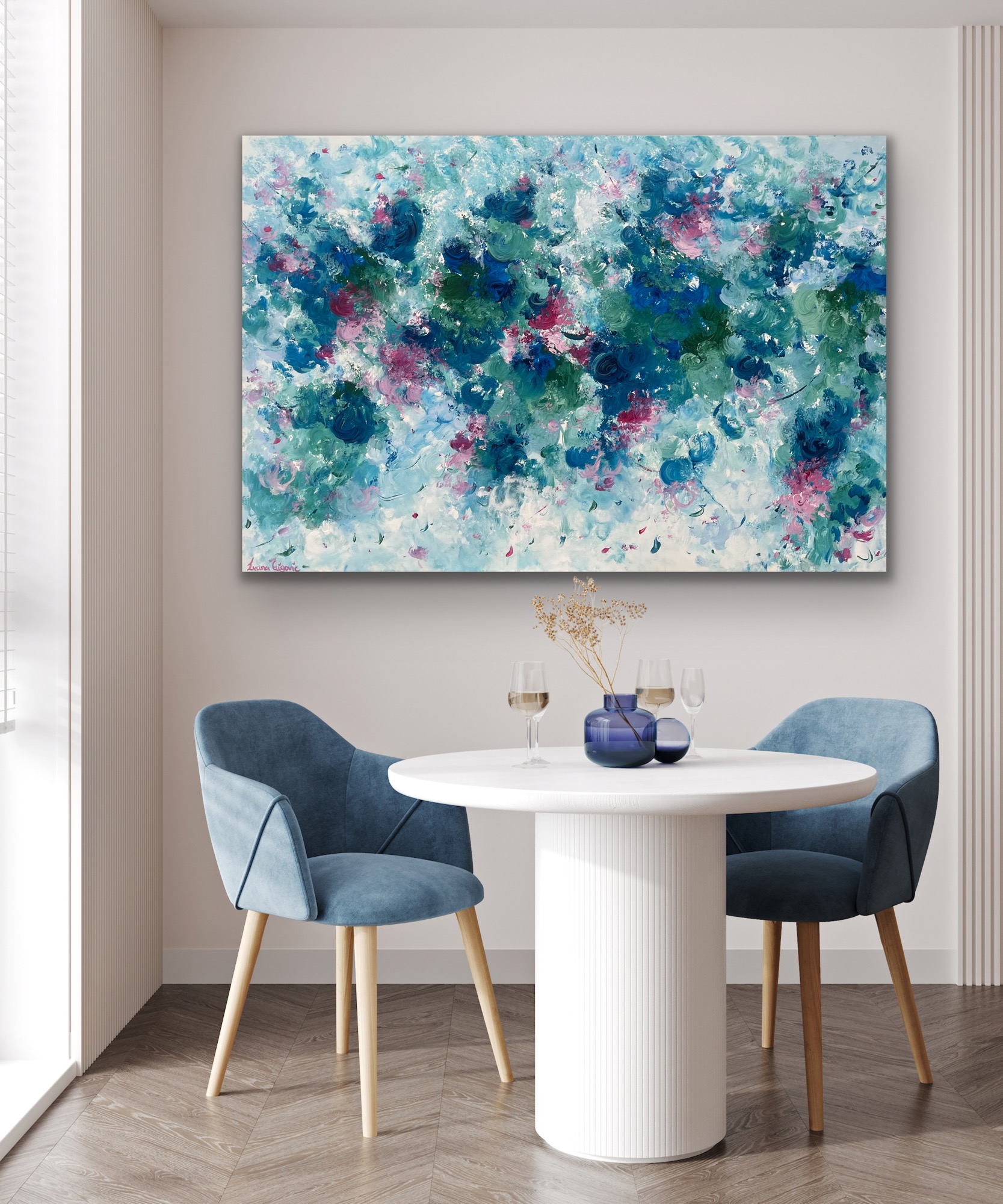 An abstract art piece that effortlessly blends the calming serenity of blue hues with the vibrant energy of green tones. The canvas is awash in a sea of lustrous blues, ranging from deep cerulean to ethereal sky blue and a touch of vibrant pink.
