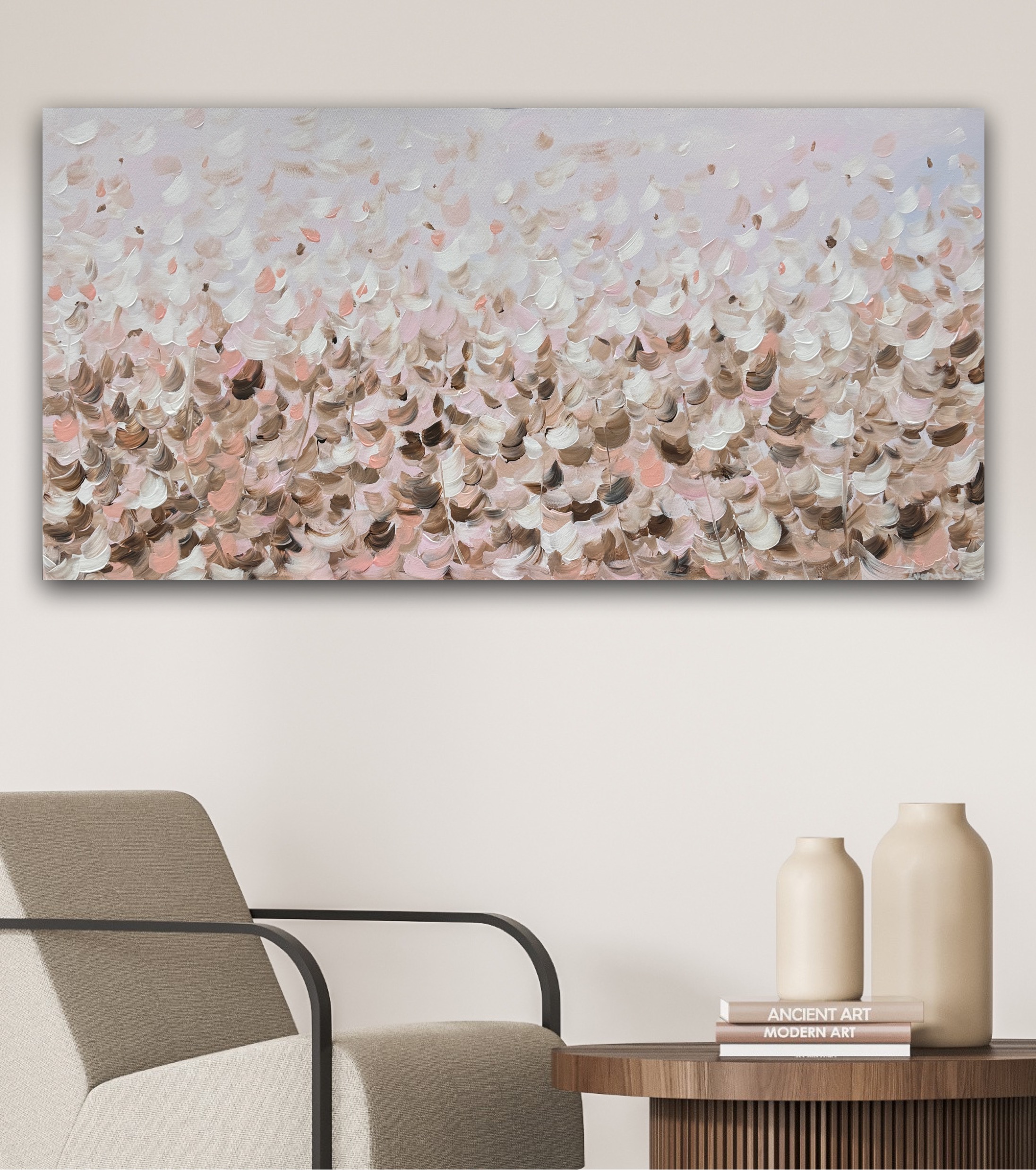 Soft petals and intricate details are rendered in soft hues of beige, ivory, and dusty pink, creating a timeless aesthetic that complements a variety of interior styles. If you’re looking to add a touch of elegance to your space, this piece offers a calming experience.