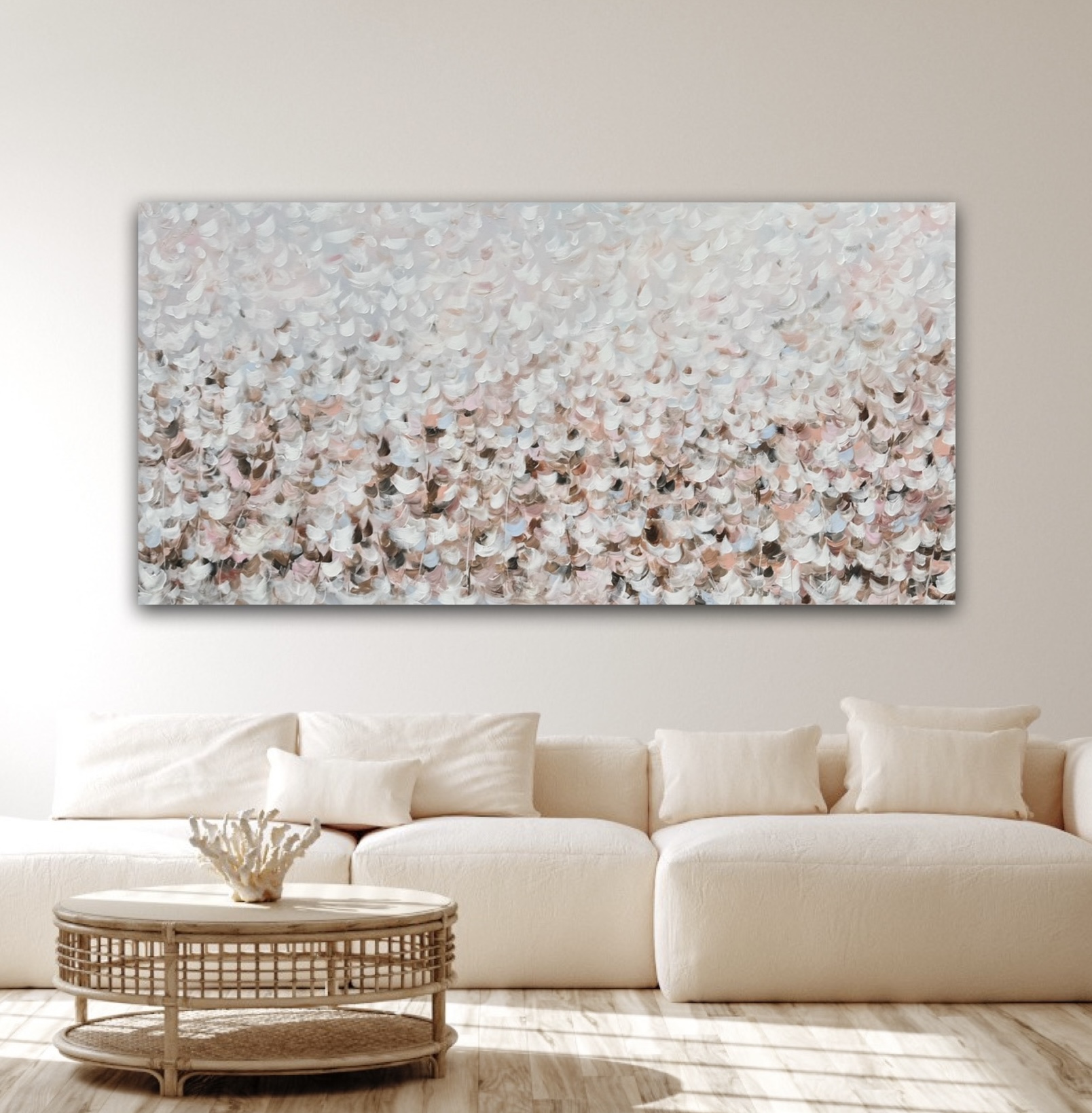 Delicate petals and intricate details are rendered in soft hues of beige, ivory, and dusty pink, creating a timeless aesthetic that complements a variety of interior styles. If you’re looking to add a touch of elegance to your space, this piece offers a calming experience.