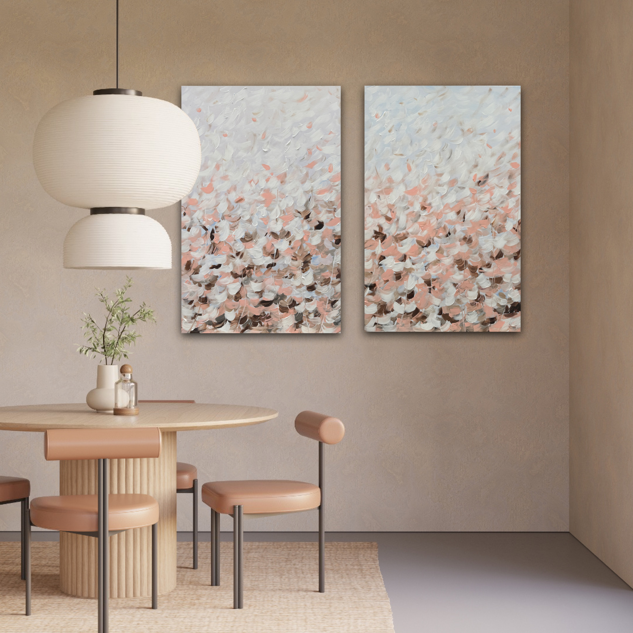 This palette includes blush tones, beige and subtle accents of warm browns and apricot. The brushwork gives an impression of delicate petals or a blooming field creating a sense of depth and movement. A calming addition to any space.