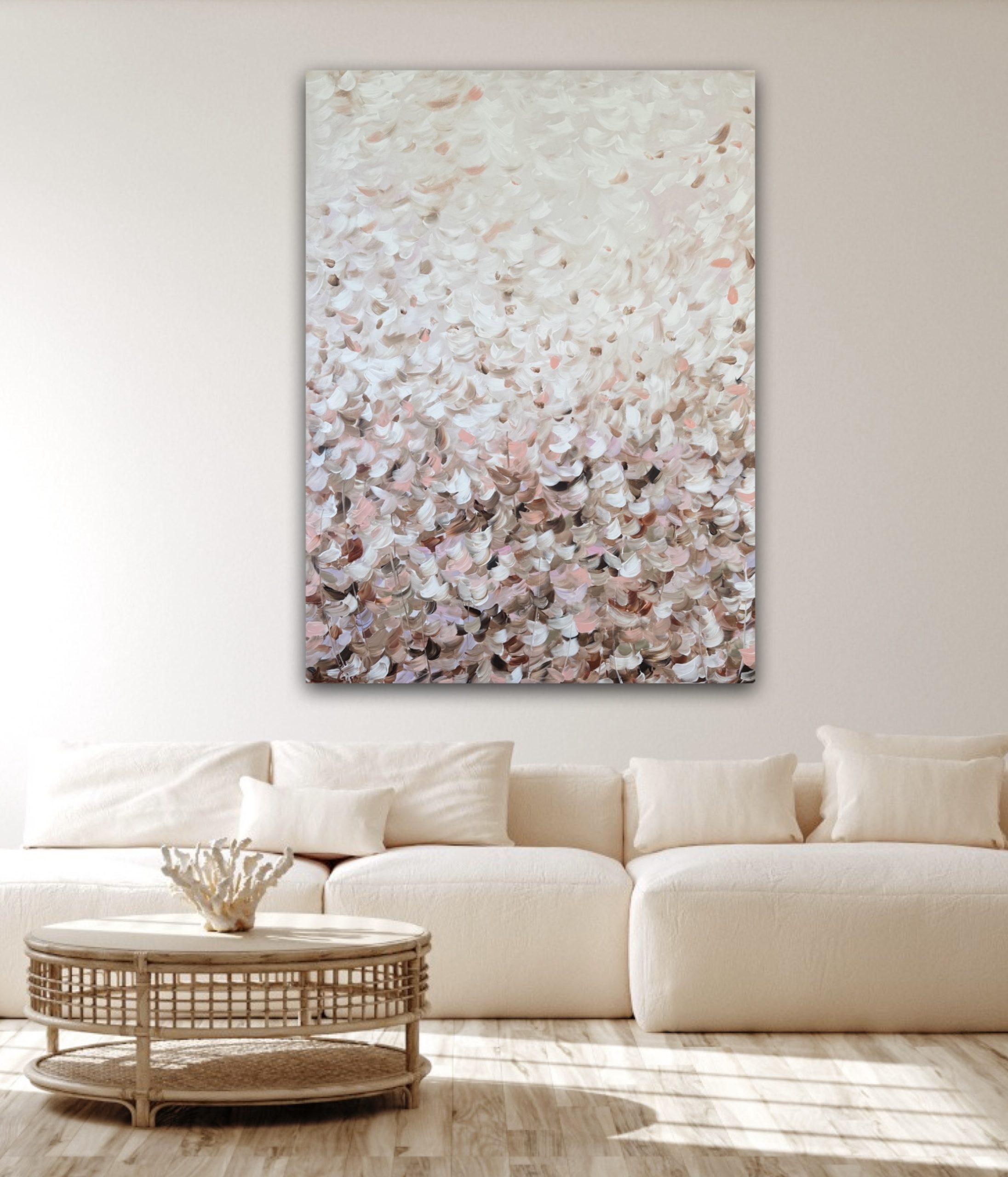 A gentle cascade of blush, cream and earthy tones dance across the canvas, creating the feeling of standing in a field of petals caught in a warm breeze. Perfect for those who love a serene and timeless atmosphere.