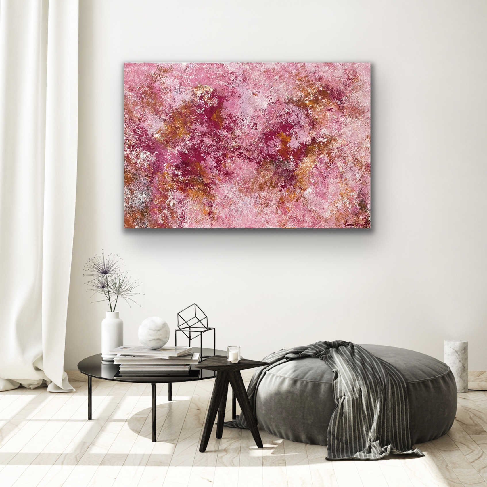 This painting is inspired by the things that make us smile. I wanted to create an artwork that brings a sense of joy to any room with vibrant and warm shades of magenta, pink and browns. A painting that adds a warm touch to your home.