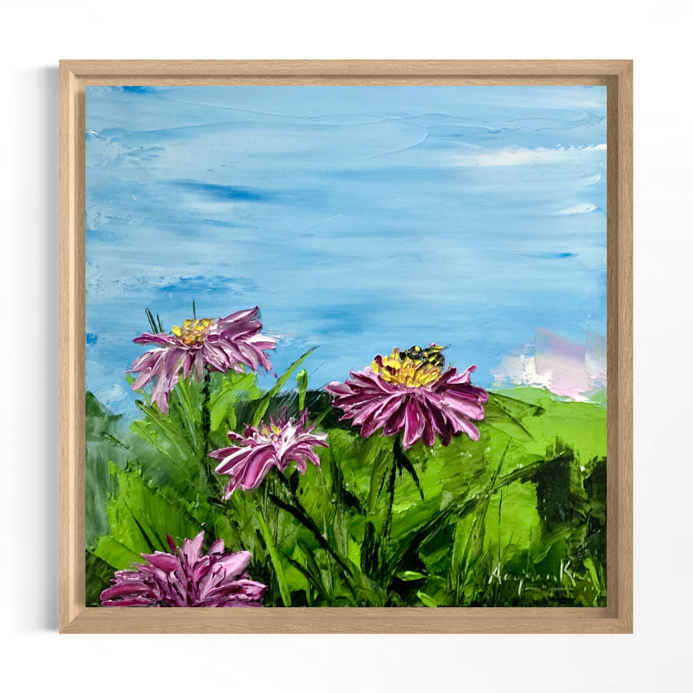 This textured painting is a beautiful and intricate work of art. The painting features beautiful purple flowers in green field with pale clear sky on top and a small bumble bee hovering over it.
