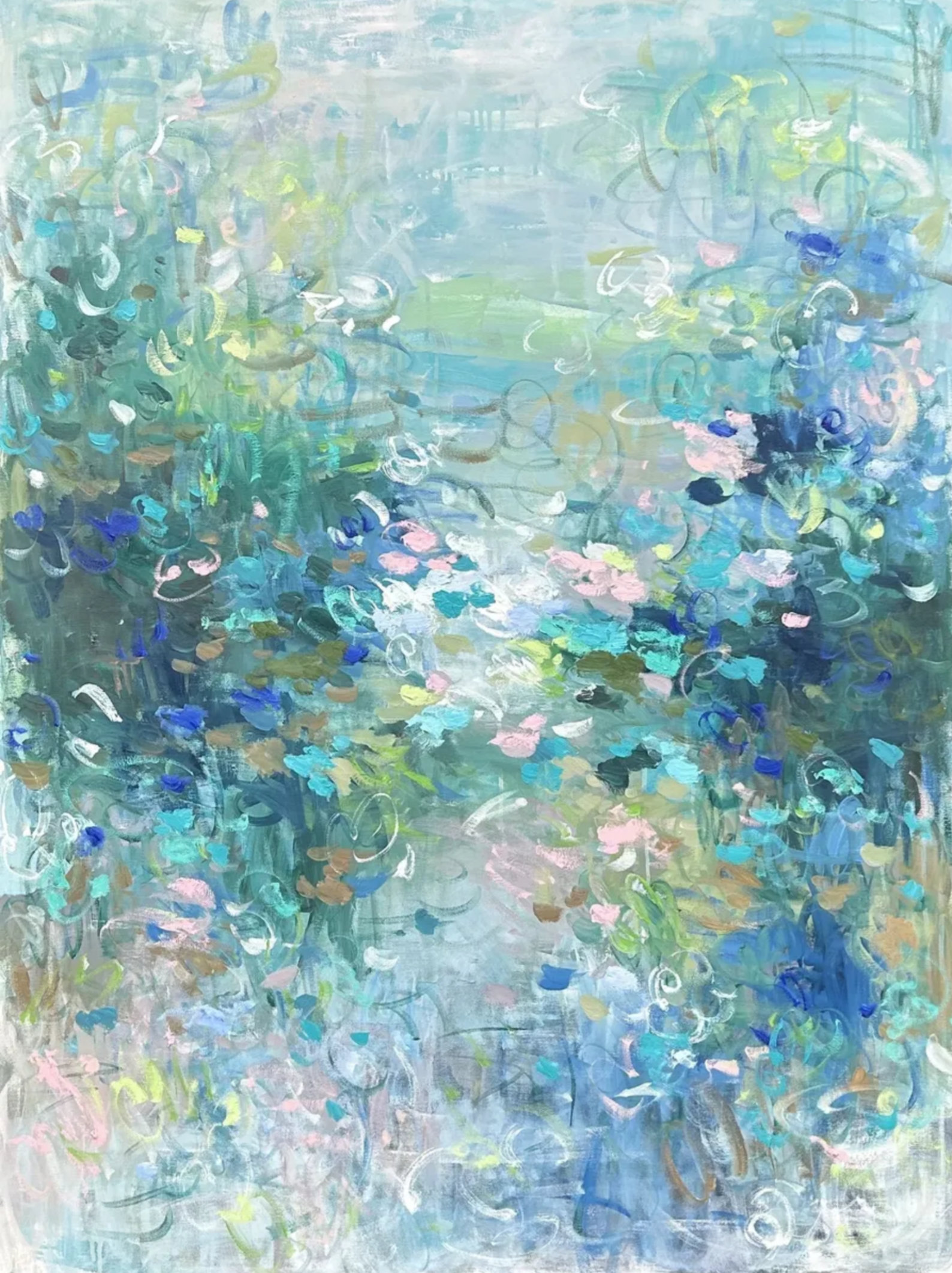 This abstract oil painting by Belinda Nadwie is a luminous blend of moody greens and blues, softened by delicate strokes of white and hints of pale pink. The ethereal composition evokes a dreamlike landscape, suggesting themes of emotional depth and quiet transformation. The interplay of colors symbolizes nature’s cycles—growth, healing, and renewal—while the subtle pink represents hope or tenderness emerging from within the haze. It’s a piece that feels both introspective and expansive, inviting viewers to lose themselves in its tranquil atmosphere.