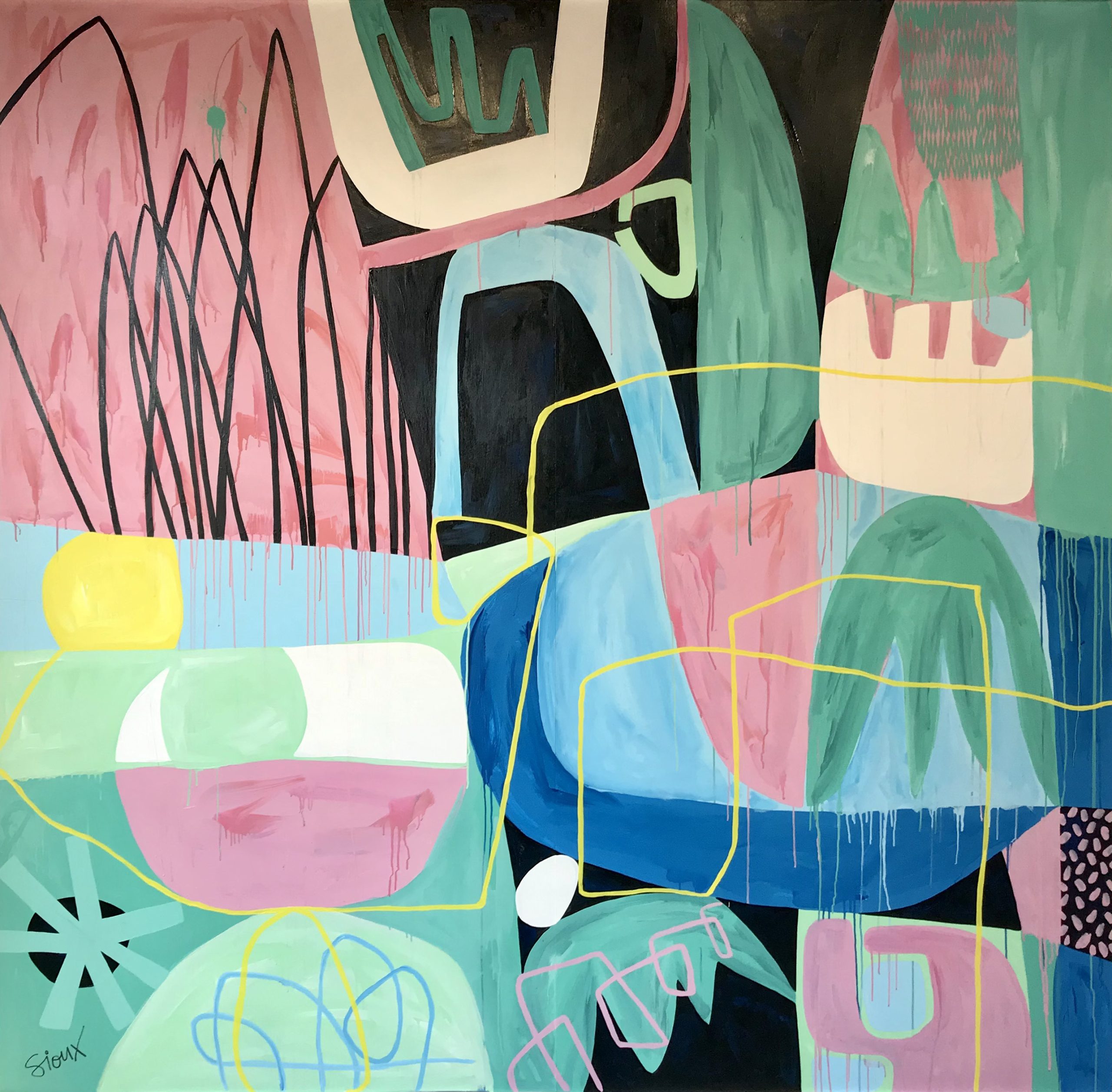 It’s What’s Underneath That Counts by Sioux Tempestt – This massive mural-stye abstract was created during a residency at the stunning Lost Eden Creative in Dwellingup WA. I’m modelling in one photo so you can get a sense of the grand scale! Inspired by nature, I created a balanced composition using different sections of colour. There’s much to discover with blended paints, mark making and pattern work. I love the playful nature of the shapes and yellow line work weaving across the top. The pop of yellow sun draws your eye in and the intentional drips create a delicious contrast. Painted with Dulux Weathershield UV paints on marine grade plywood means this mini-mural is suitable for hanging outside in an undercover courtyard. Of course, it would look just as stunning inside if you have a large space to accommodate.