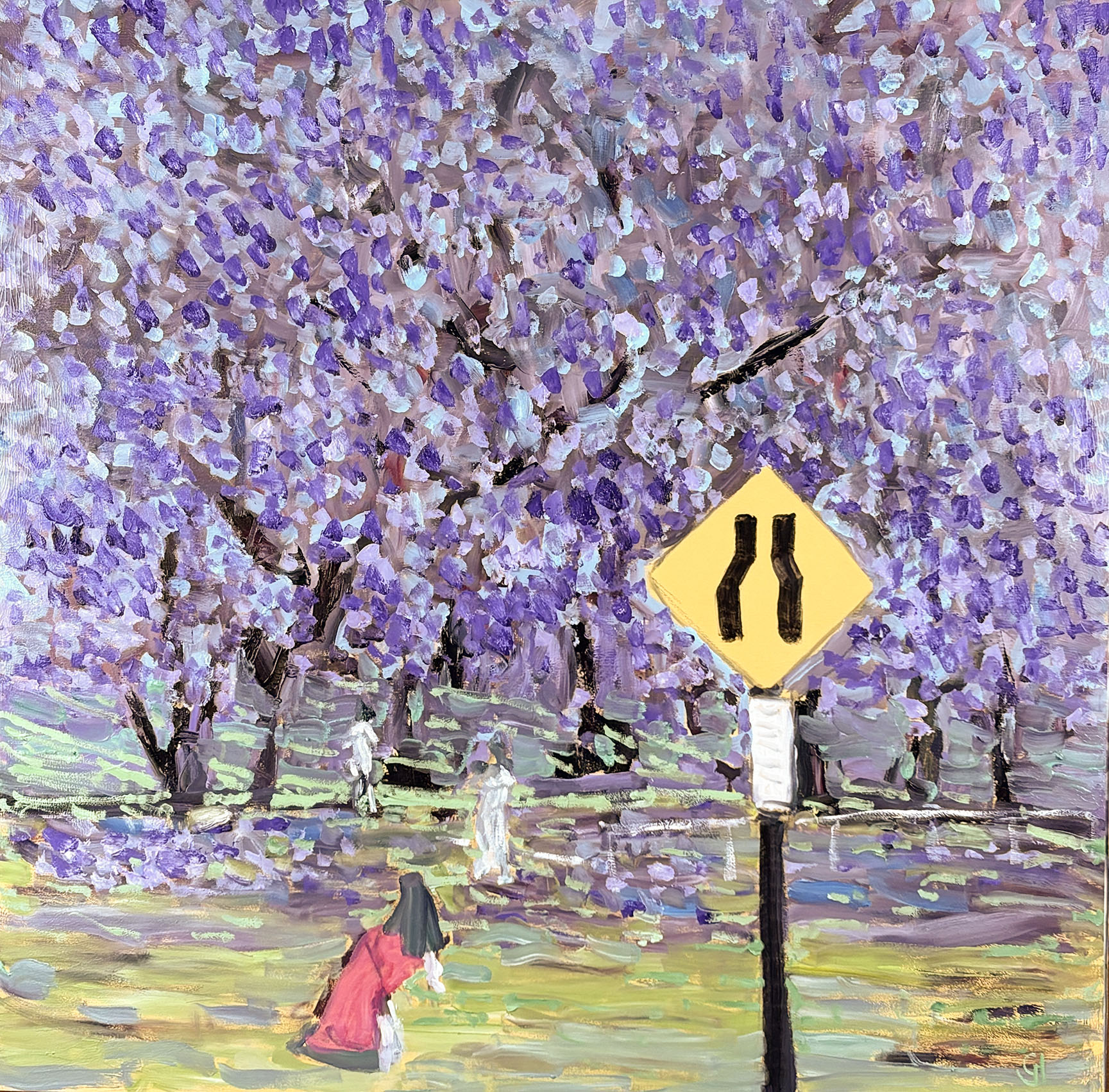 Original oil painting of people photographing themselves amongst Jacaranda Trees in Bloom.