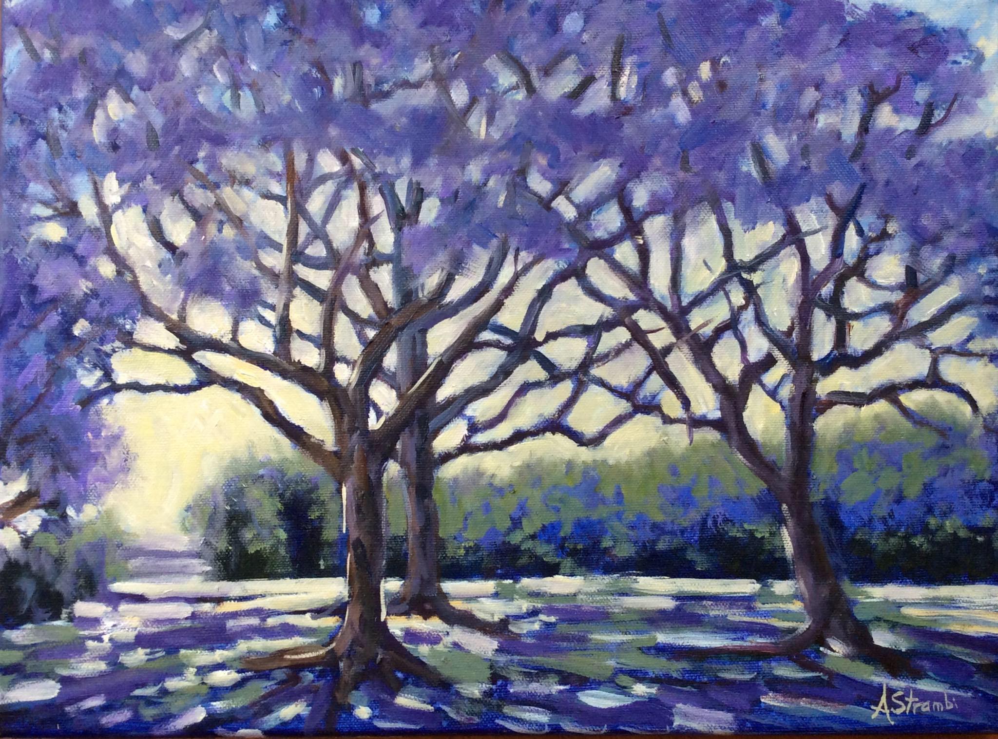 Jacaranda Haze by Anne Strambi – This oil painting features the beautiful purply-blue of the jacaranda trees in a park, reminding me of my childhood in Grafton, NSW, where they bloom in abundance every October. I was inspired to paint them after attending a workshop with talented artist David Hinchliffe, and learning a new method of painting the negative shapes of a subject. I love the light shining through the trees and the dappled shade underneath.
