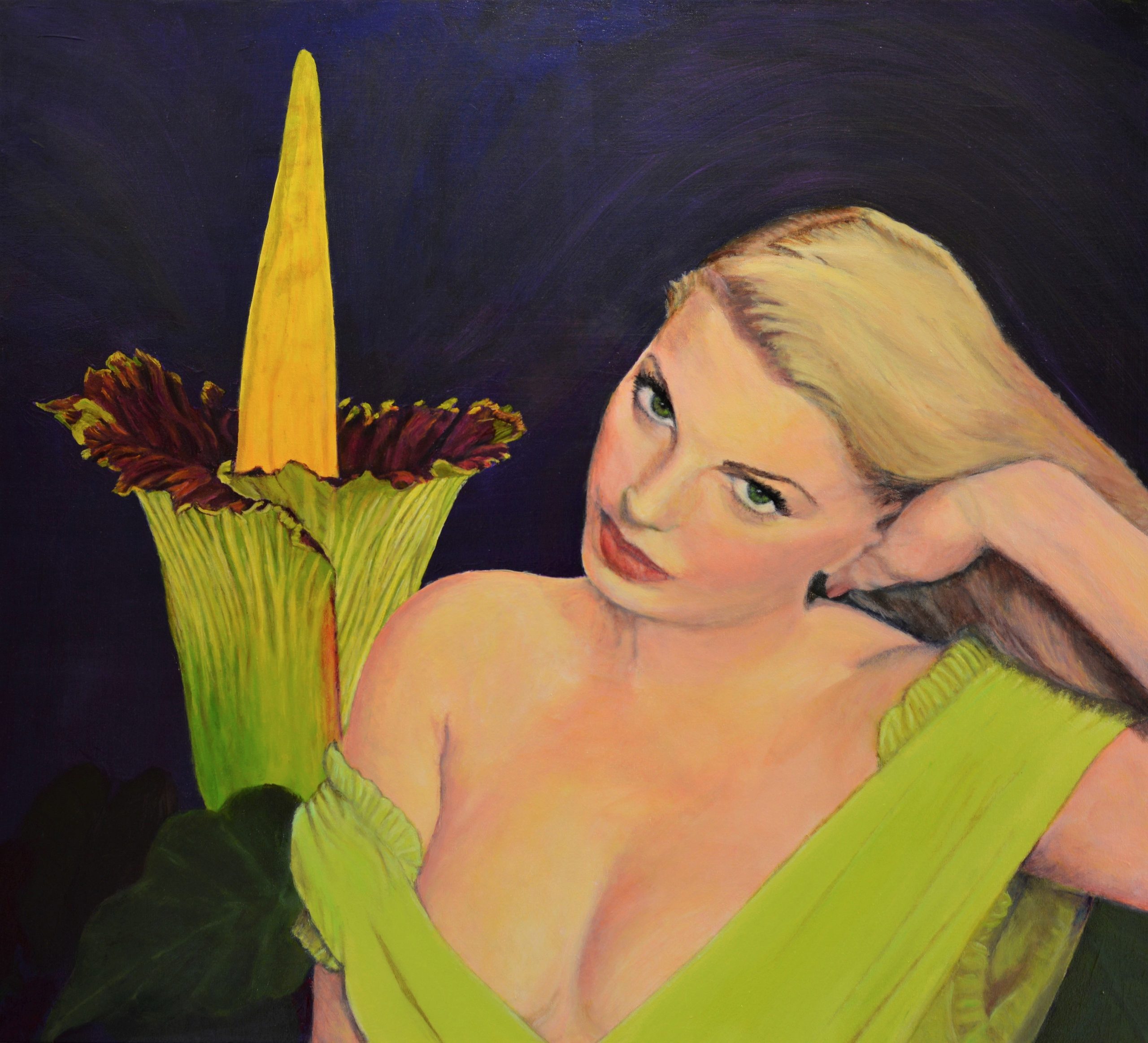 Aphrodite appropriates a photo of a young woman from a detective pulp magazine cover of the 1950s and places a stink lily in the background. The resulting painting suggests fertility and desire. The painting has beautiful metallic and interference colors and a gloss varnish finish