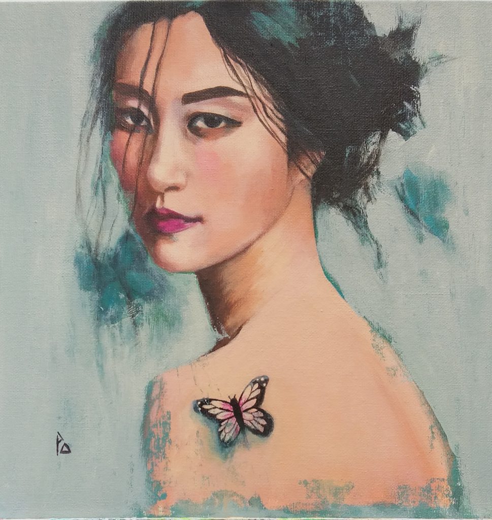 A portrait style Japanese maiden with butterfly tattoo on her back an original piece of art.