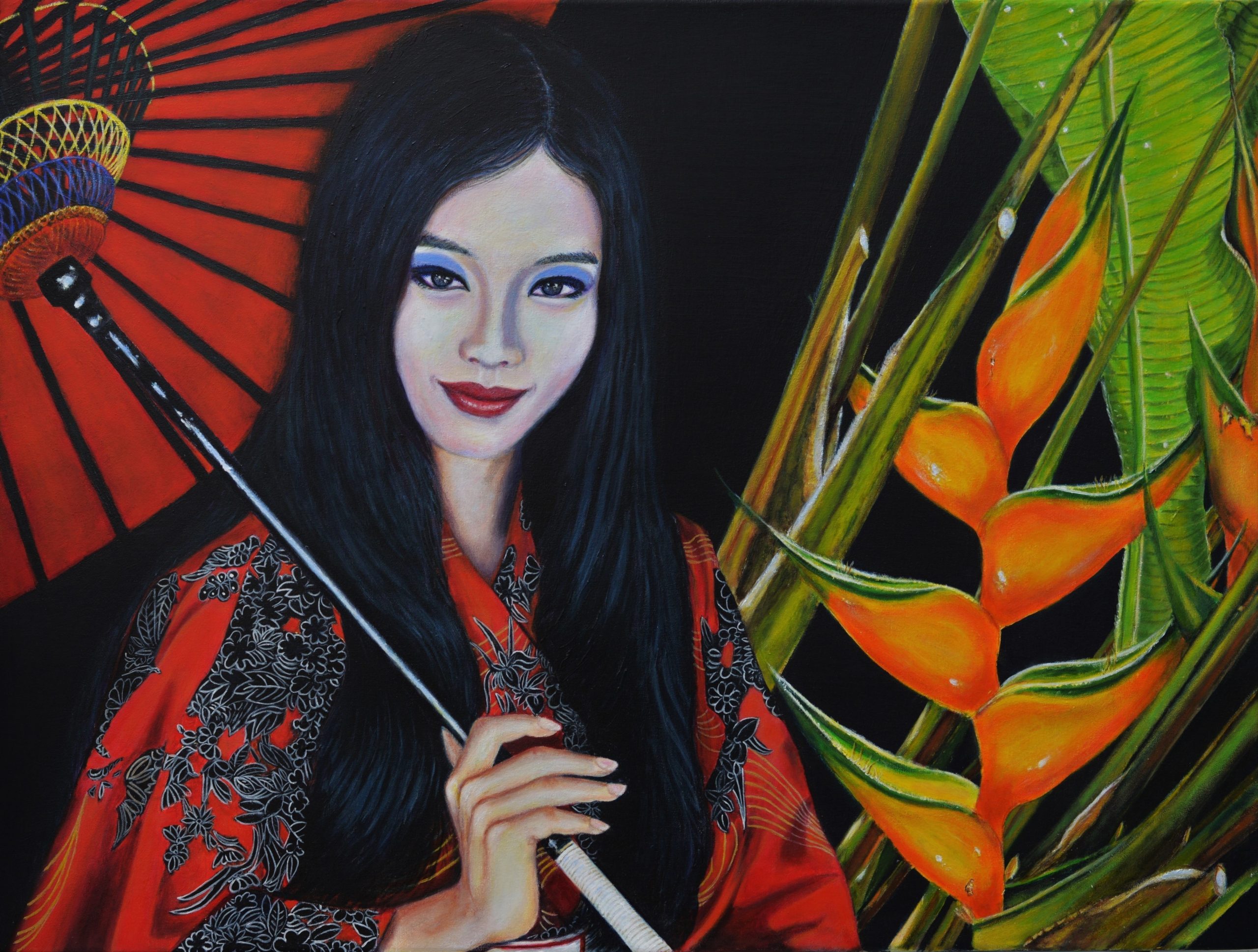There is little doubt that Heliconias are beautiful plants and placing one next to the refined beauty of a Japanese woman creates the foundation of an appealing painting. I enjoyed working on the meticulous detail and complimentary colours of this painting that illuminate and captivate.